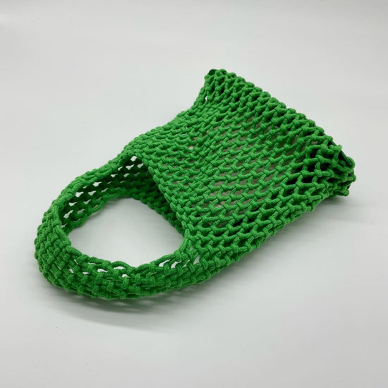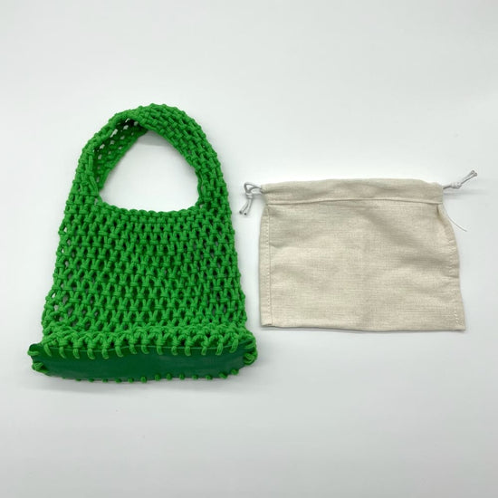 This small crochet bag in green comes with a removable tie up internal bag. Perfect for carrying your phone, keys, sunglasses,