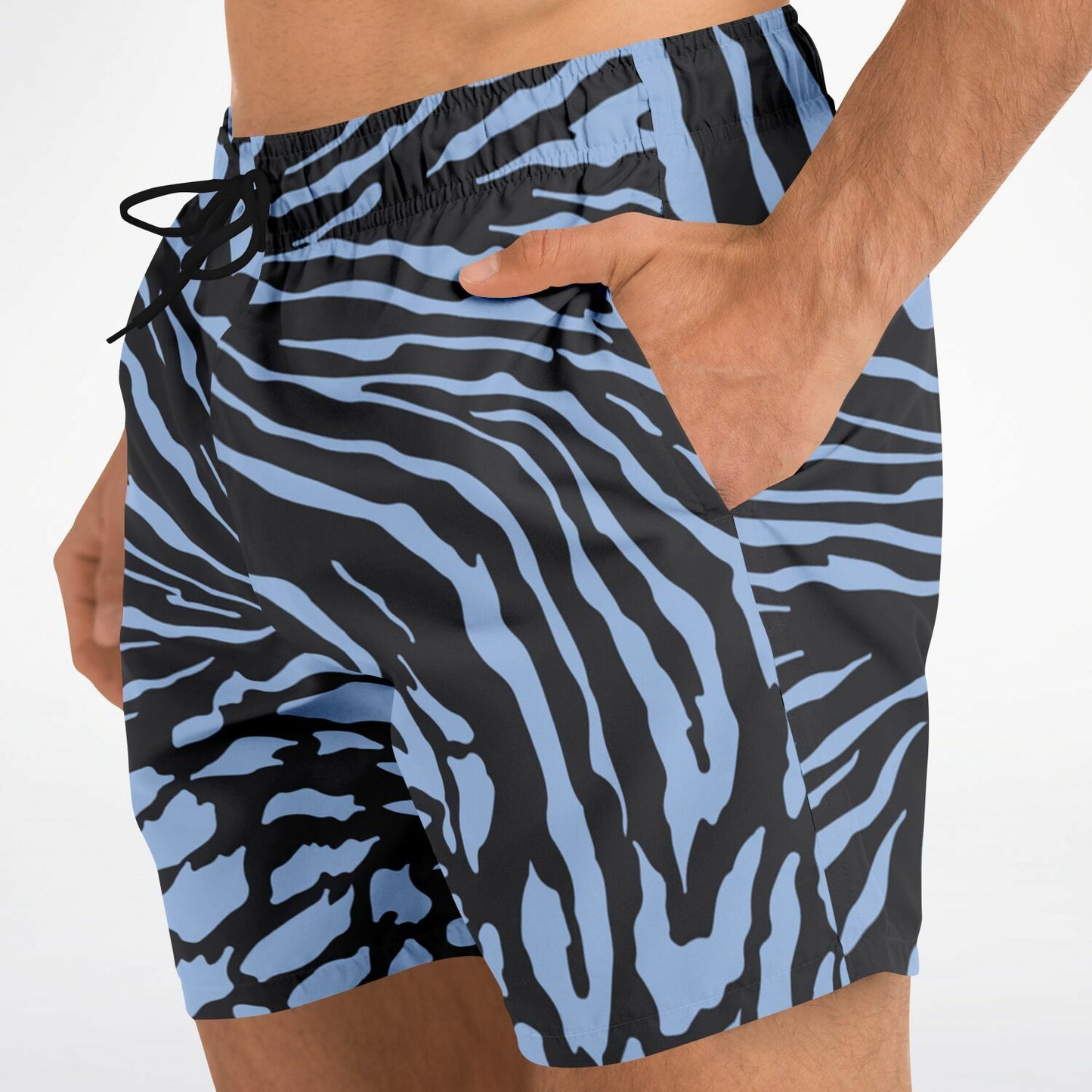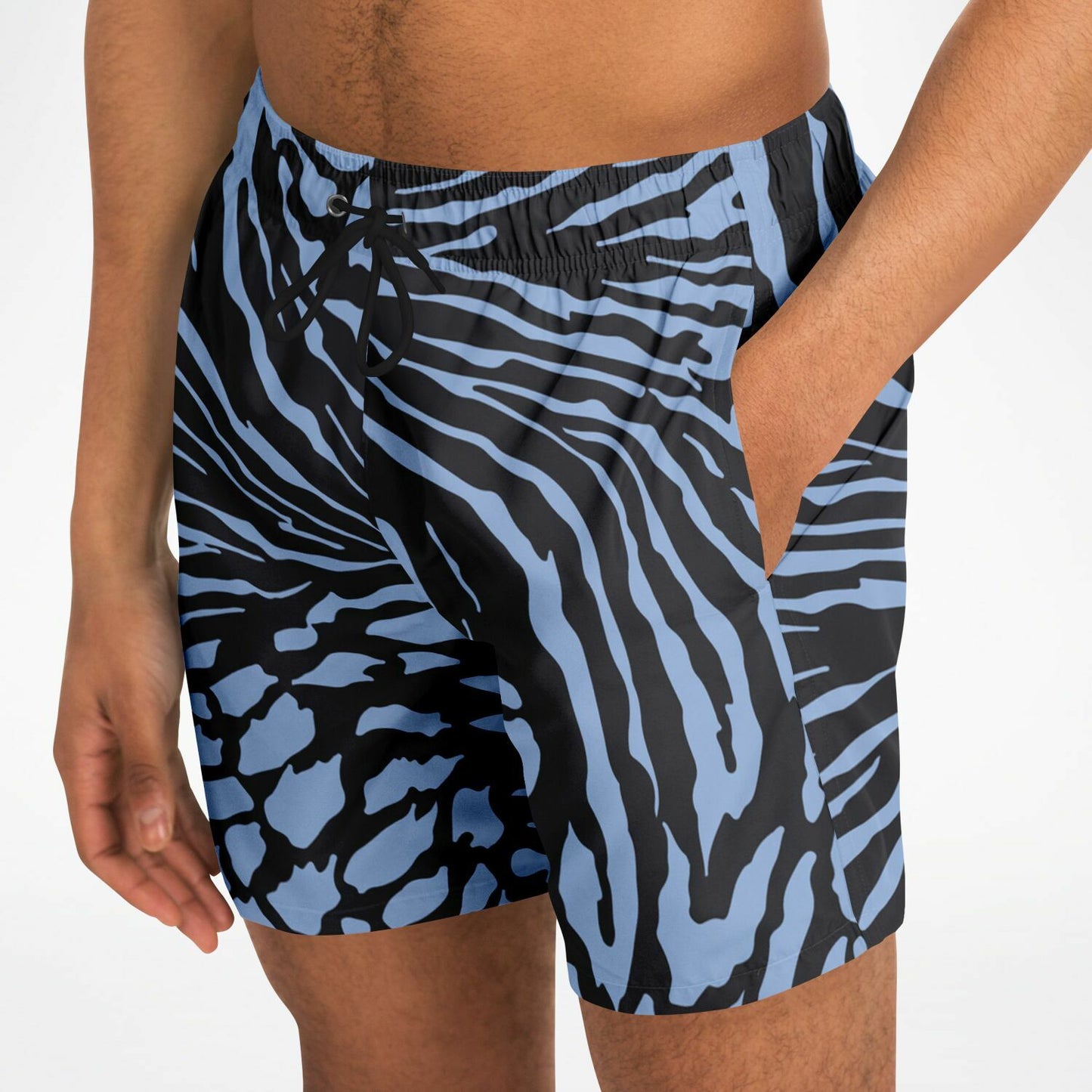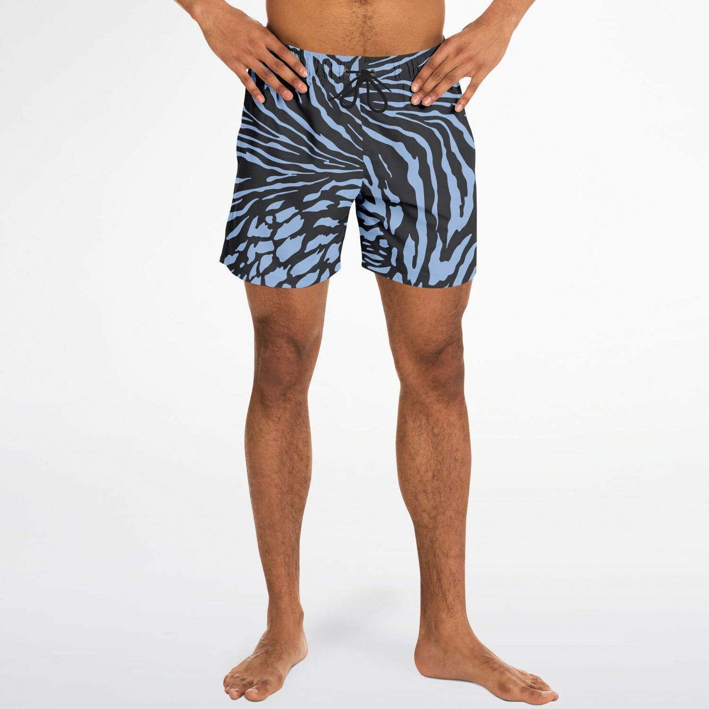 Turn heads with these bold blue and black animal stripe swim shorts, inspired by wild patterns and made for comfort. Crafted from quick-dry fabric, these mid-length swim trunks feature mesh-lined pockets, an internal basket liner, and an adjustable drawstring waist for the perfect fit. Ideal for beach days, pools, or casual summer adventures.