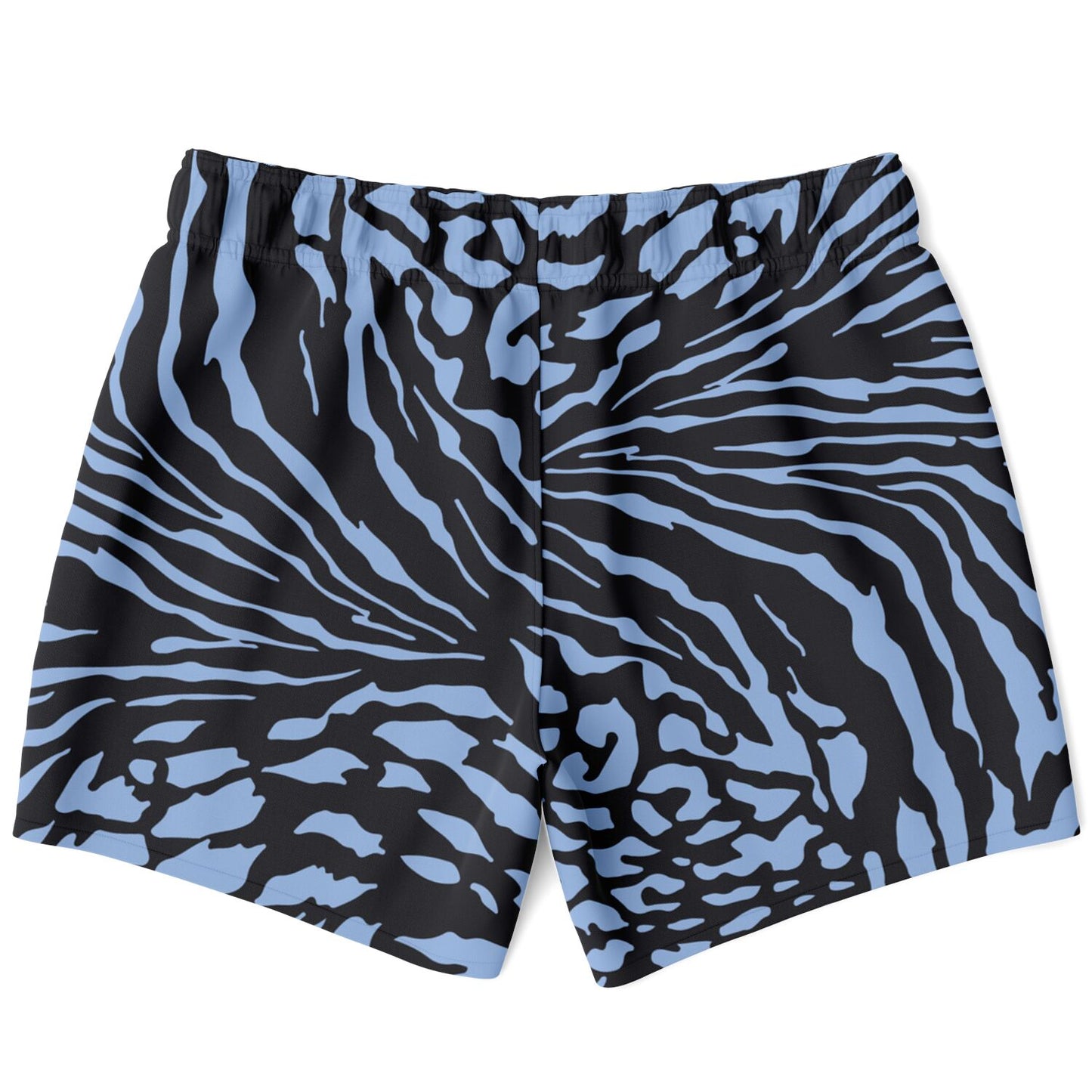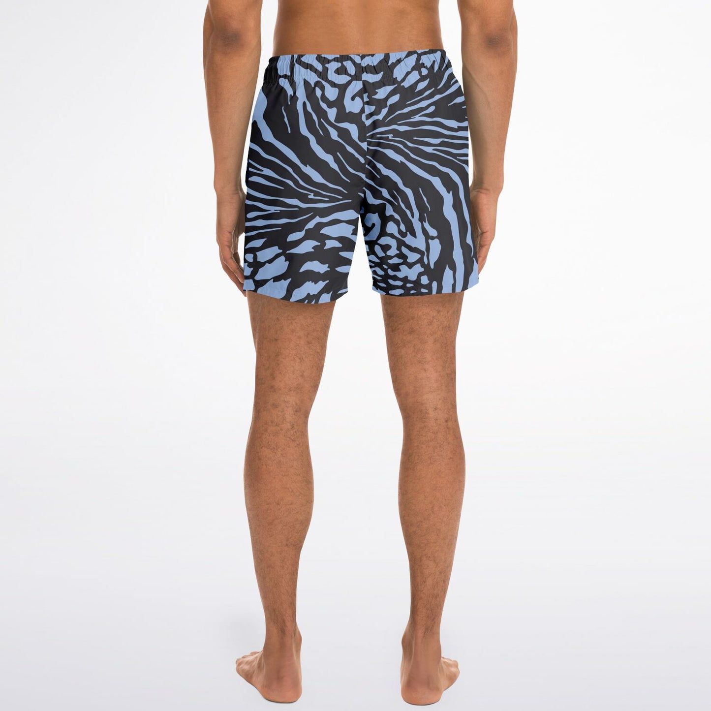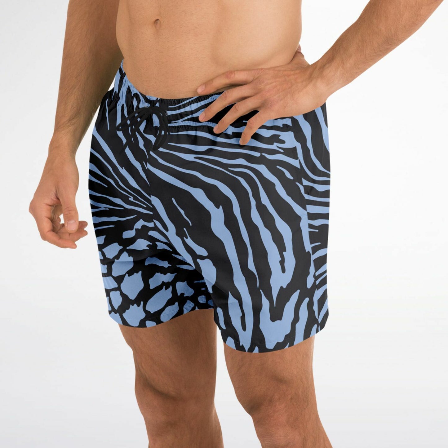 Turn heads with these bold blue and black animal stripe swim shorts, inspired by wild patterns and made for comfort. Crafted from quick-dry fabric, these mid-length swim trunks feature mesh-lined pockets, an internal basket liner, and an adjustable drawstring waist for the perfect fit. Ideal for beach days, pools, or casual summer adventures.