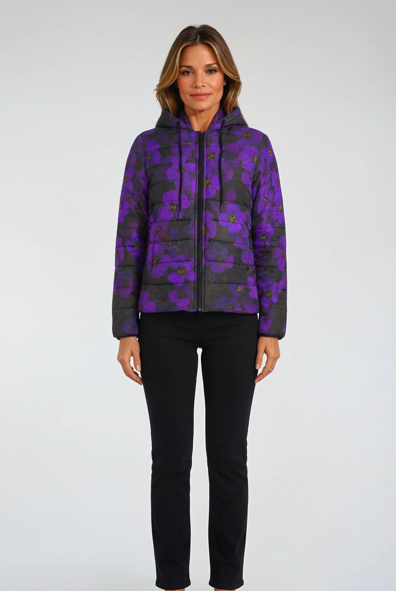 Our Midnight Purple Flower Womens Hooded Puffer Jacket features stunning all over purple flowers. This lightweight jacket is versatile for the cooler seasons with all over padded comfort