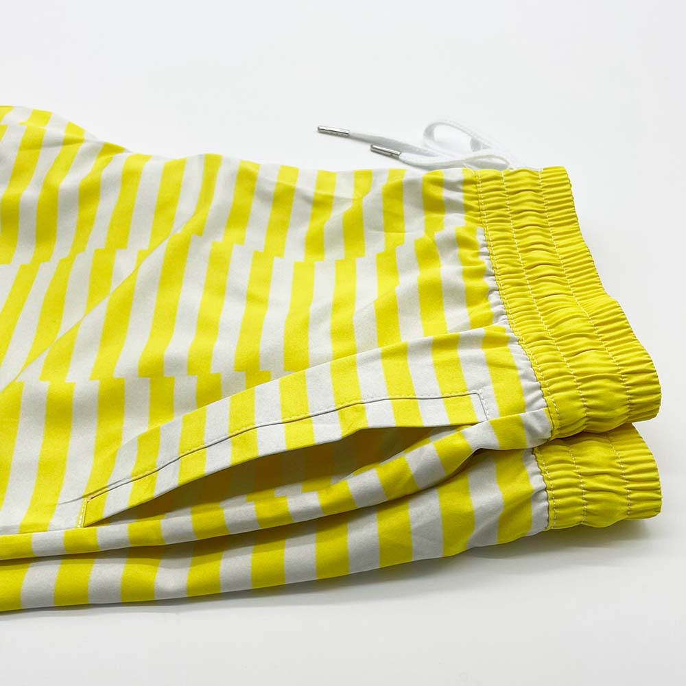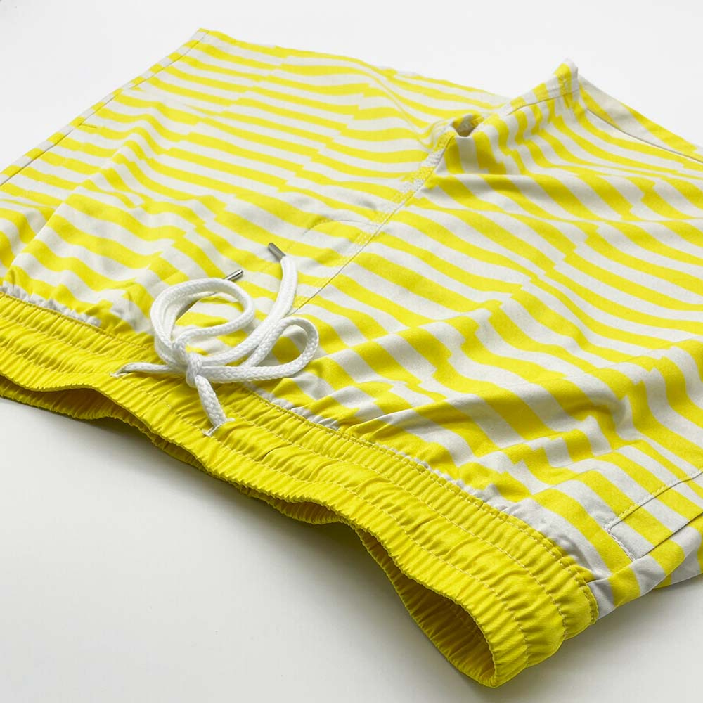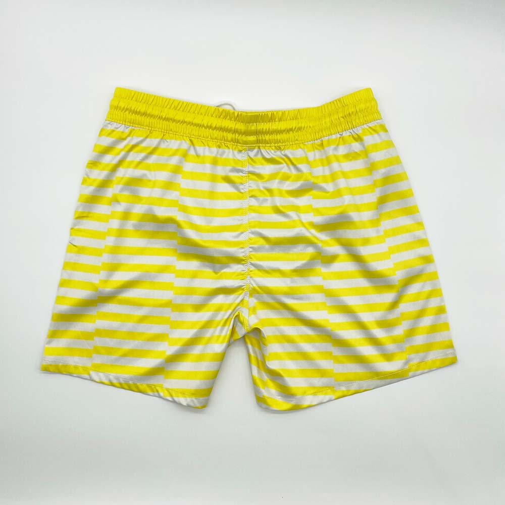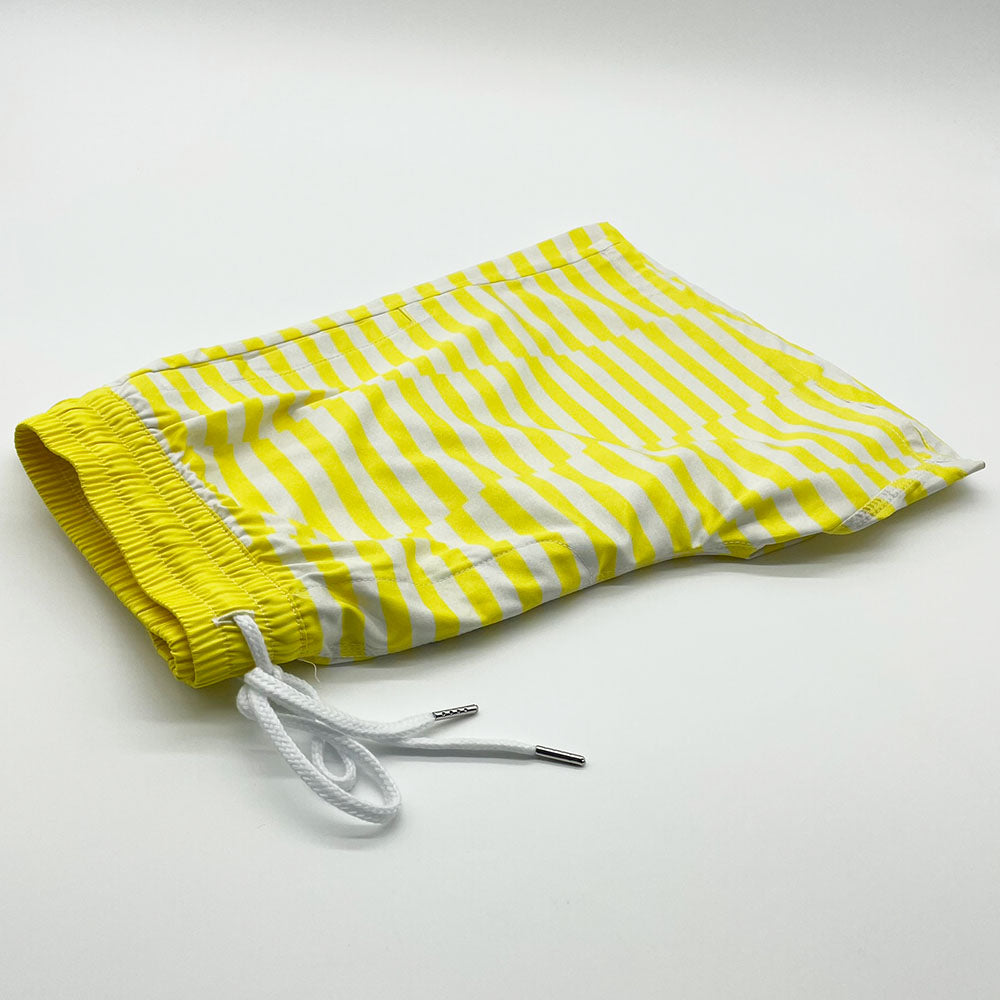 Our Zone Yellow Striped Swim Shorts are all you'll need this summer. The yellow stripe pattern is on trend and looks great against your skin tone. They feature two side pockets, white interior mesh lining, and adjustable waistband with fabric drawcord. Manufactured from superior quality material with fine stitching.