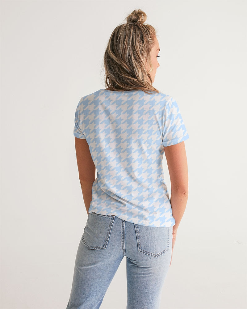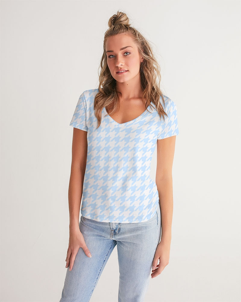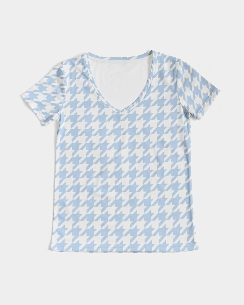 Our Baby Blue Houndstooth V-Neck Tee features a large houndstooth pattern in blue. Handmade from soft, breathable fabric with a slim fit and V-neckline. Dress it up or down, tucked in or not the choice is yours.