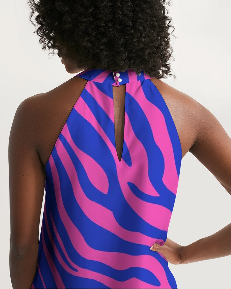 Our Electric Zebra Halter Dress is bound to turn heads. Handmade from polyester chiffon material and fastened in the back with two chic pearl buttons. A gorgeous dress when a splash of color is required.