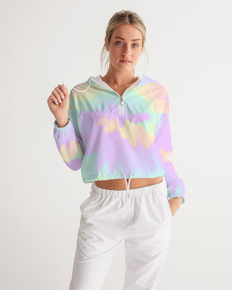 Our Lilac Mint Tie Dye Cropped Windbreaker features an all over pastel print in purple, green and orange. Made of lightweight, water-resistant fabric, this windbreaker has flexible styling options. Perfect with activewear, joggers, pants and jeans it is versatile enough to be worn on a run, at the mall or a night on the town. Premium quality design with full lining. The bright pastel print makes and cold and dull day warm.