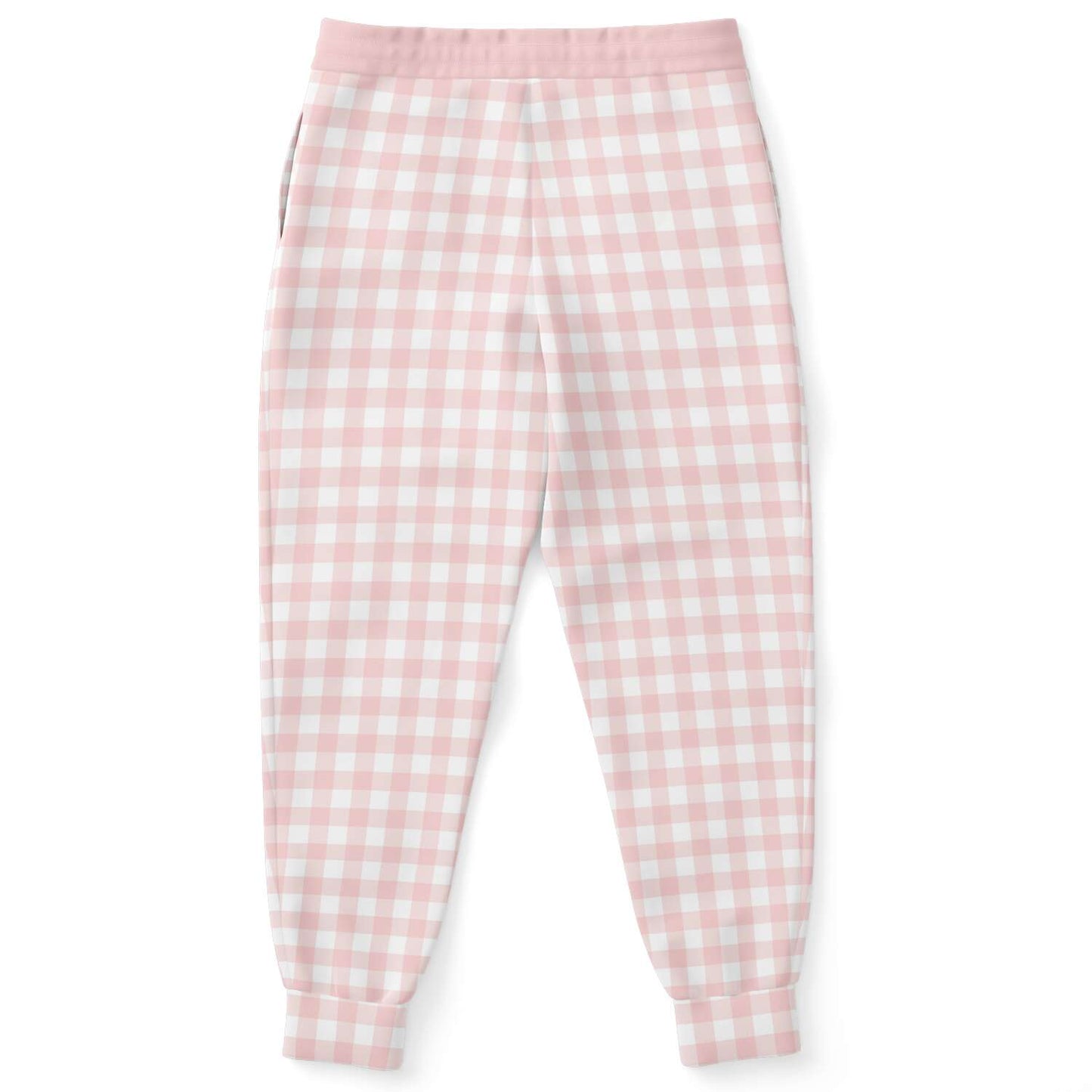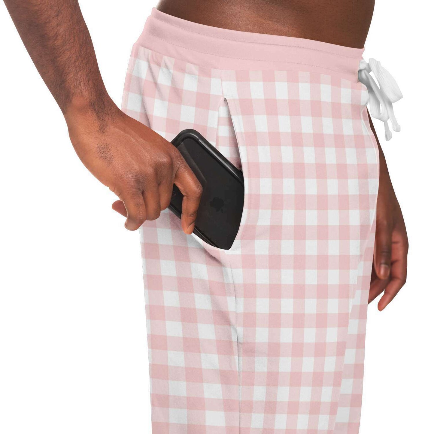 Our Pale Pink Gingham Check Unisex joggers have a soft contemporary feel. They feature an all over pink gingham check pattern. They pair great with a tee, hoodie, sweatshirt or jacket to provide a unique look. These unisex fleece joggers feature a soft and durable fabric that has a cotton feel, whilst the brushed fleece on the inside adds warmth and comfort.