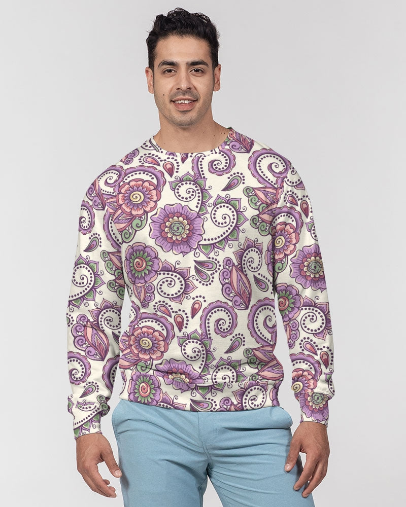 Our Purple Cream Paisley Classic French Terry Crewneck Pullover has a bold all over paisley print. The regular fit is not too big, but not too tight so you can layer it or wear it alone. Finished with a smooth surface on the outside and loop knitting inside for the right amount of warmth and comfort.