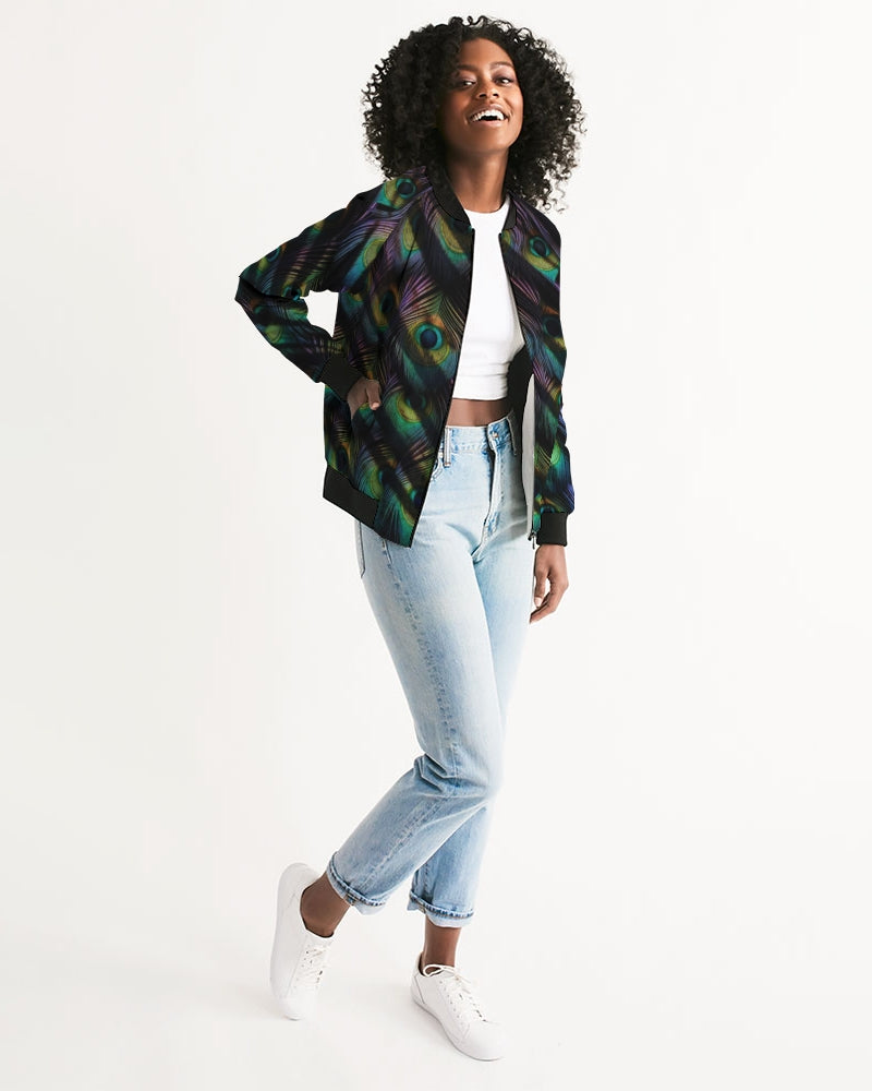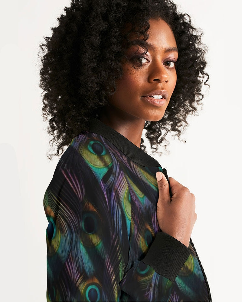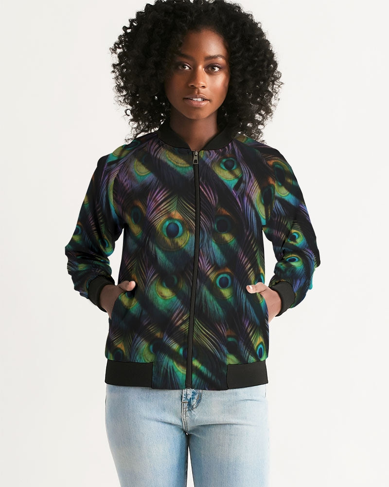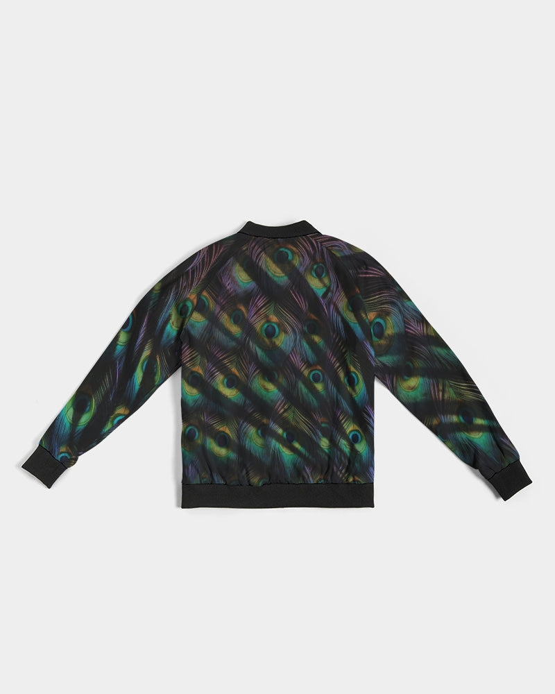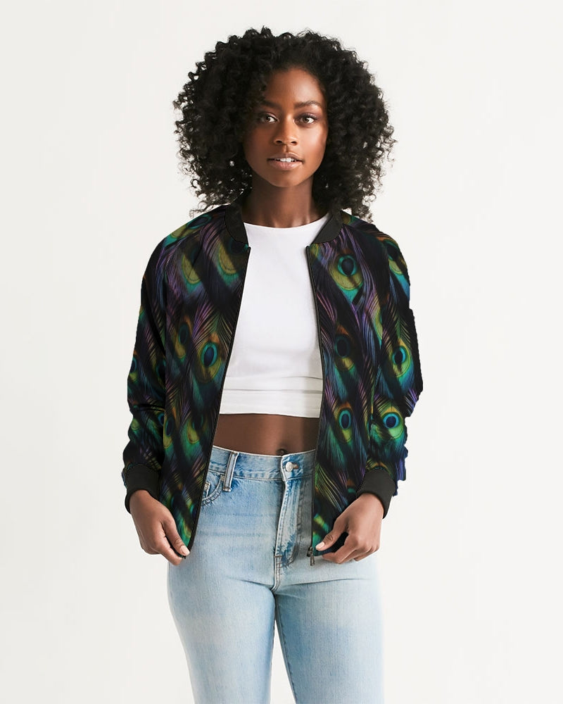 This bold, original print fuses vibrant peacock feathers in iridescent green, blue, and purple with layered tiger stripe textures that seem to scorch through the pattern. The result? A jacket that’s fierce, fluid, and unmistakably luxe. The jacket is fully lined for comfort with a smooth outer shell, making it the perfect lightweight layer for everyday styling, cool nights, or statement looks. Finished with classic bomber details and a modern, feminine fit. Whether you’re turning heads on the street or elevating your weekend fit, this piece blends art and attitude in every stitch. Designed by Harlow & Lloyd