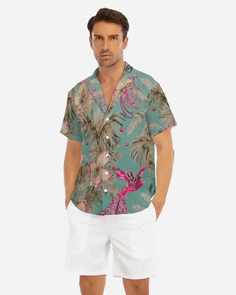 Our Vintage Bird & Tropical Palm V-Neck Short Sleeve Shirt features a stunning all over vintage tropical print. Perfect for the warmer months, it features a contemporary V Neck collar design.
