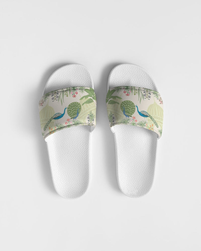 Slip on these tropical and botanical-inspired slides for a touch of nature in every step. Our Indian Garden print features ferns, palms, flowers, peacocks, plants and a rotunda. These Men's Slides are perfect for long sunny days in style and comfort!