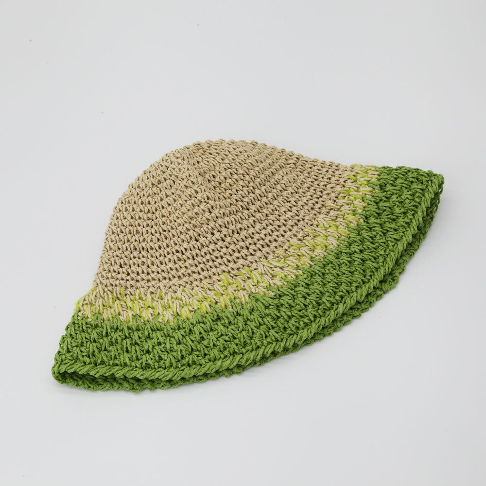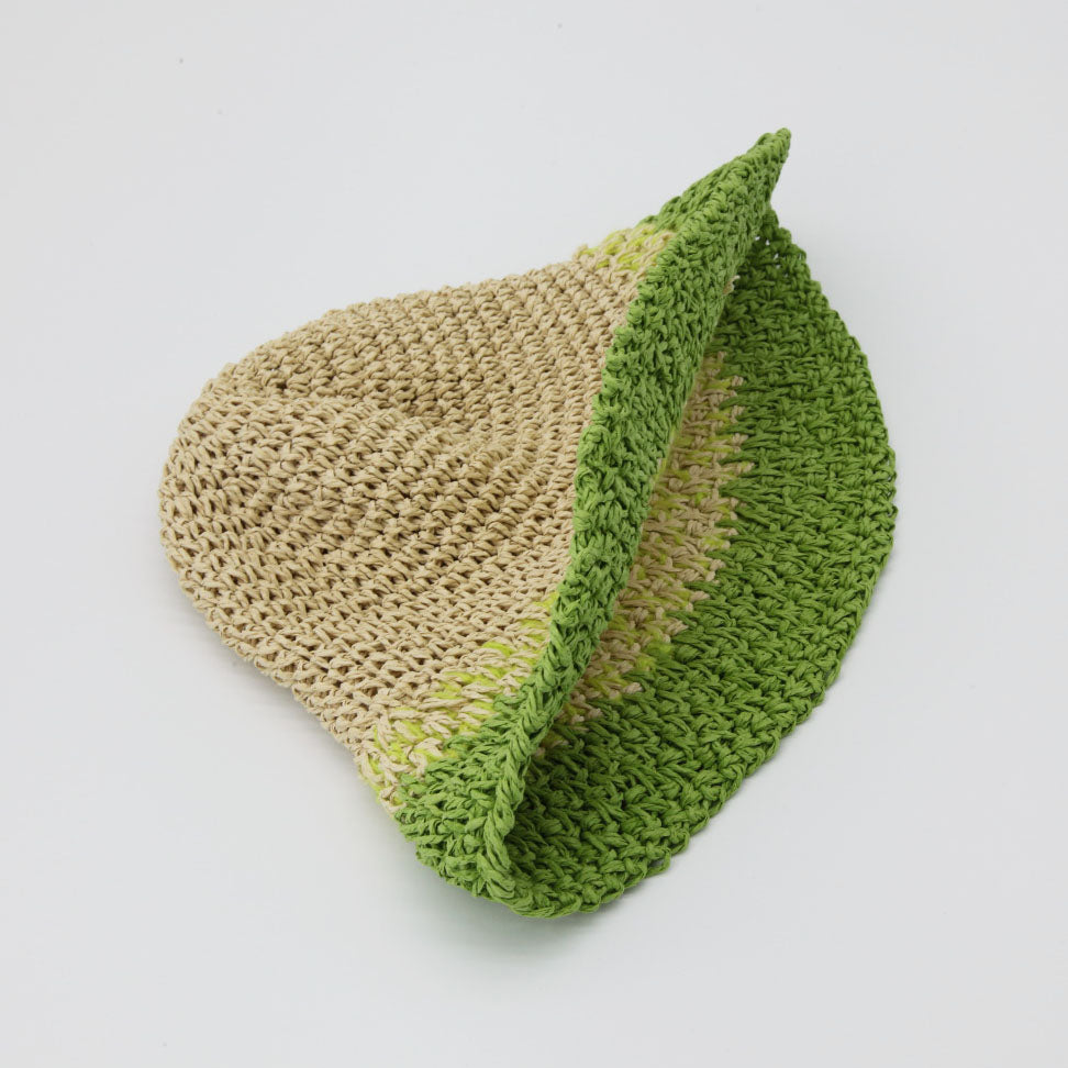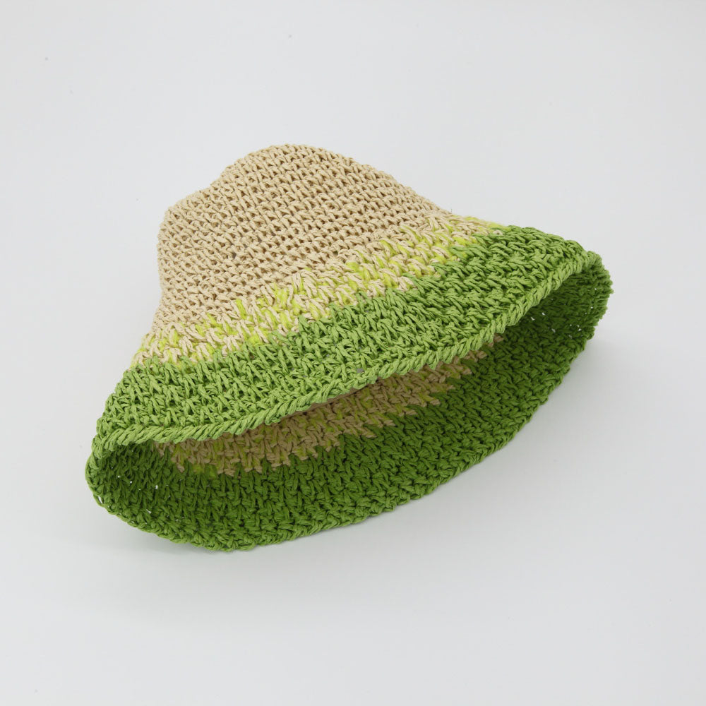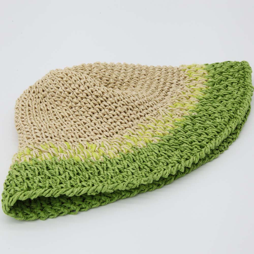 The perfect accessory for summer, this straw crochet bucket hat in green, chartreuse and natural will complete your look. The wide body provides great coverage from the sun while the straw fabric is cooling and breathable.