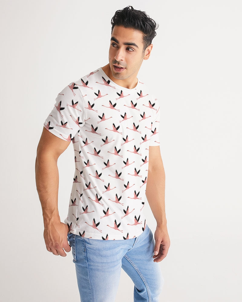 Our Flying Flamingos Mens Tee is handmade with premium wear resistant fabric. Goes perfect with jeans, shorts or swimwear. Made with a soft breathable fabric. A cute design with all over flamingos for a summery feel.