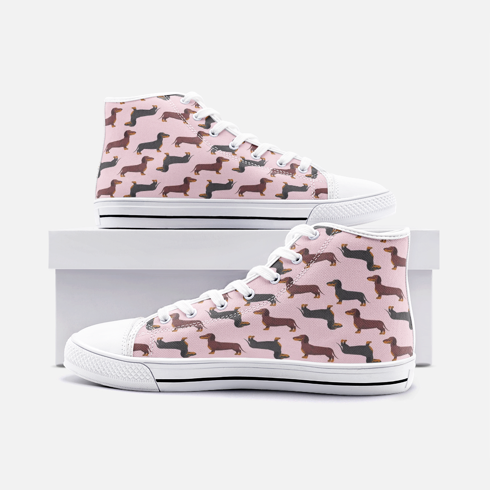 Step up your sneaker game in these cool High Top Canvas shoes with cute Dachshund pattern. With a rounded toe construction they feature soft textile lining, and lightweight construction for maximum comfort. The lace up closure ensures a snug fit with metal eyelet for a classic look. The high quality outsole provides traction and exceptional durability.