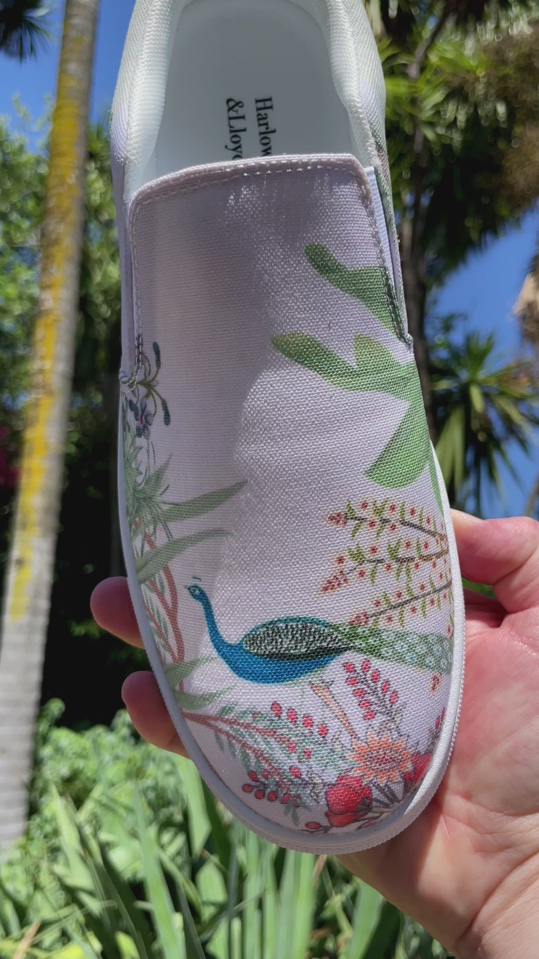 Step into paradise with our Indian Garden Women's Slip On Canvas Shoes. Featuring a beautiful tropical print of palm trees, ferns, peacocks, and flowers over a beige tone, these shoes will add some style, individuality and class to any outfit. Our Women's Slip On Shoes are all comfort with a soft removable insole, rubber outsole and padded collar and tongue. These casual slip on shoes in beige will be your daily go-to. Designed by Harlow & LLoyd.