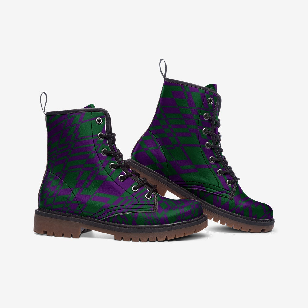 Our Leprechaun Lace Up Boots feature an abstract pattern in green and purple in a unique design.