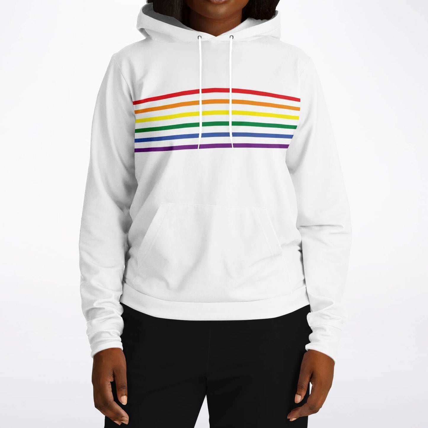 Our Rainbow Thin Stripes Unisex Hoodie features a soft and durable fabric that has a cotton feel to it. The brushed fleece on the inside provides warmth and comfort on cooler days.