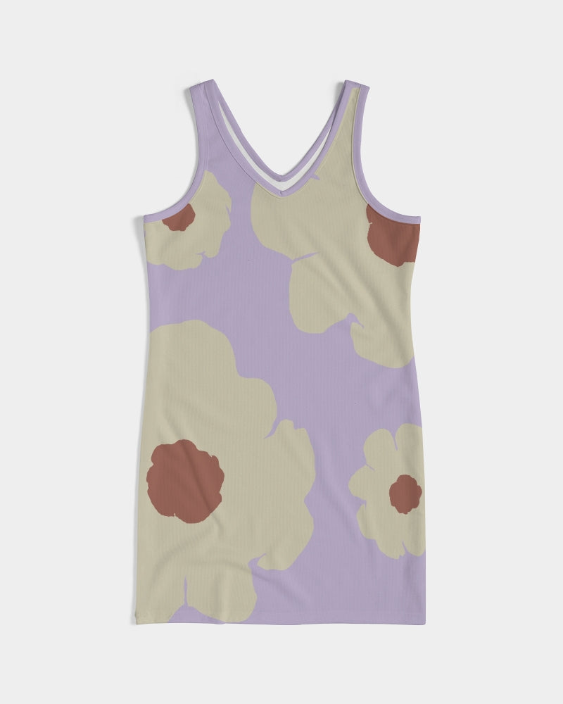 Elevate your style with our bold and contemporary Abstract Flowers Lilac Women's Rib Knit V Neck Mini Dress. Featuring on trend lilac and brown color tones and an abstract floral design, this dress is simple yet eye-catching. Versatile on its own, under a jacket or tucked into jeans. Perfect for any occasion, this dress will make you stand out and feel confident in your unique sense of style.