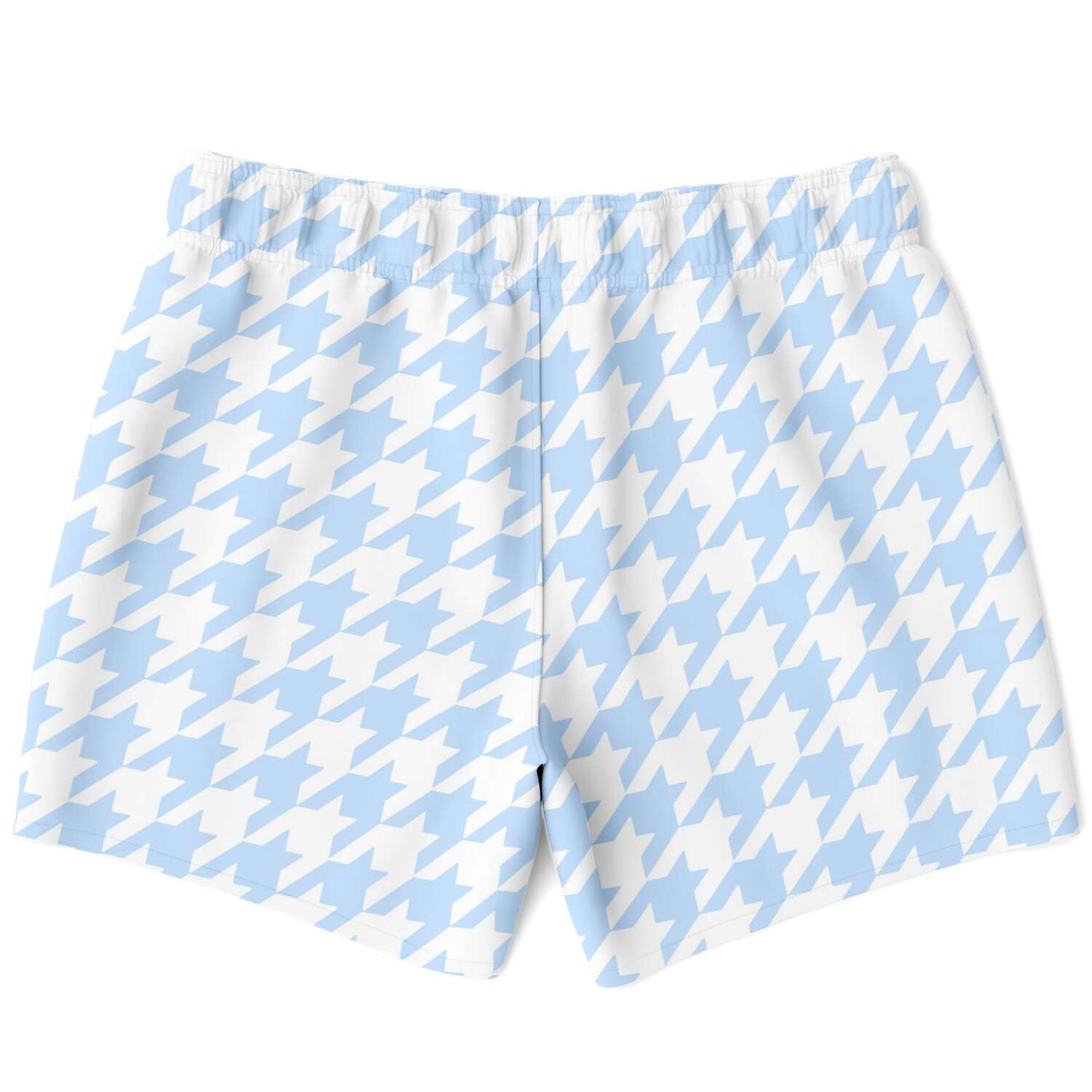 Our Pale Blue Houndstooth Swim Shorts feature a large houndstooth check pattern in contemporary pale blue. These short length swim trunks fit above the knee. They come in a fast-dry fabric, and feature a drawstring waistband, mesh basket lining and mesh-lined side pockets.
