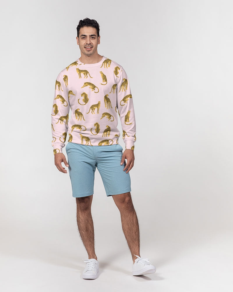 Our Pink Leopards French Terry Crewneck Pullover features a cute all over leopard print over pink. The regular fit is not too big, but not too tight so you can layer it or wear it alone. Finished with a smooth surface on the outside and loop knitting inside for the right amount of warmth and comfort.