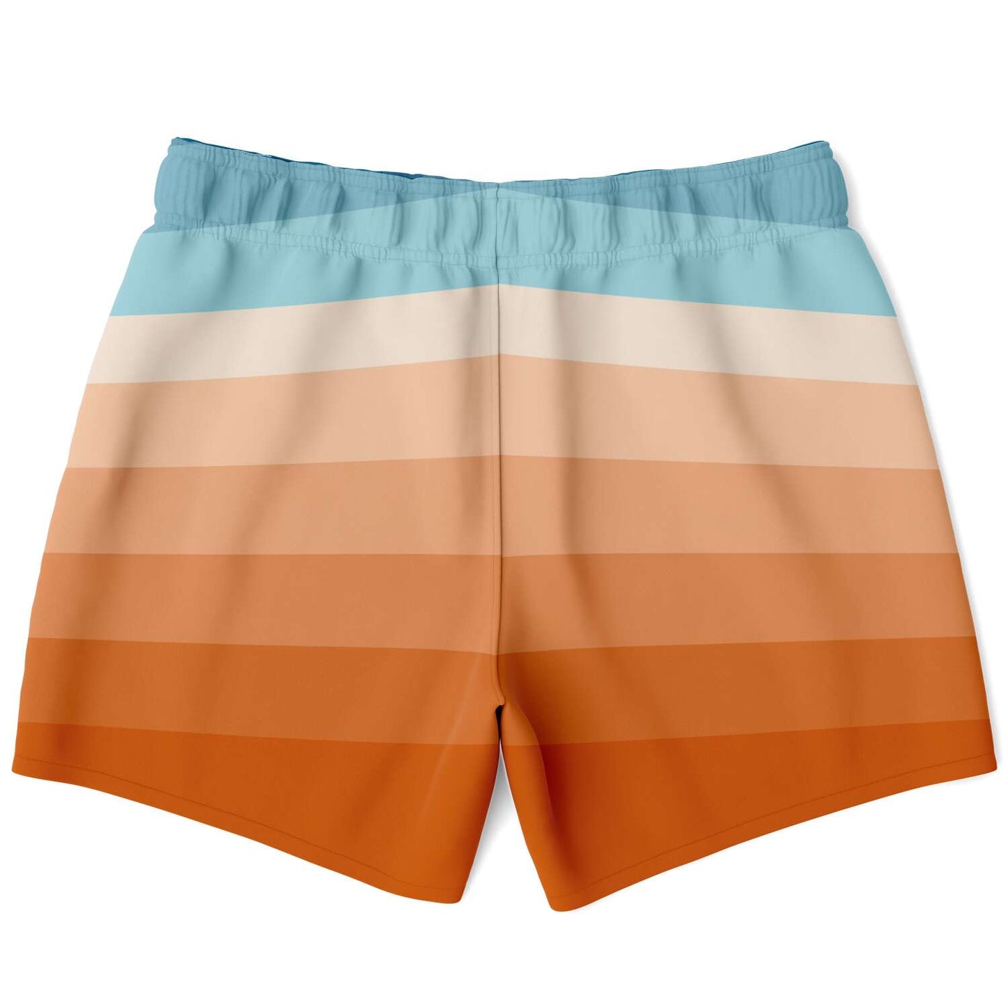 Our Sunshine Blue Swim Shorts feature a super cool retro lined pattern in orange and blue tones - perfect for Summer.