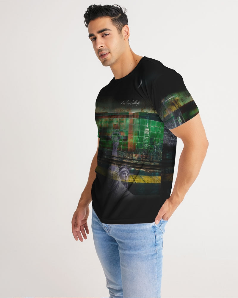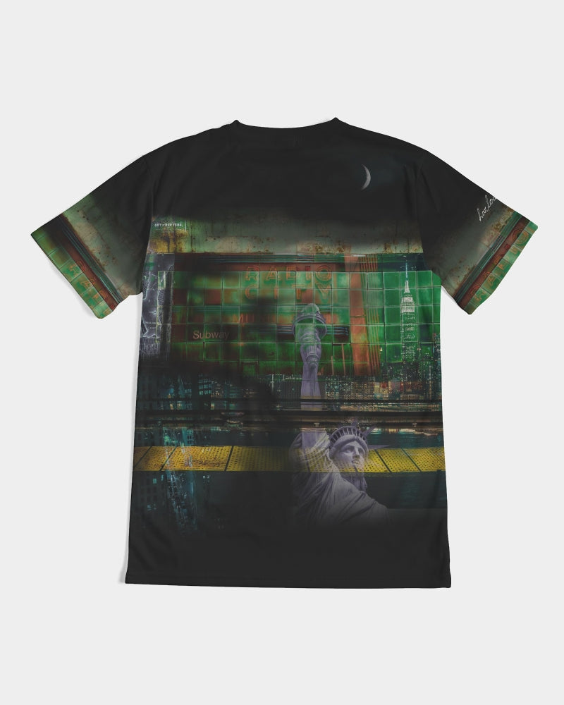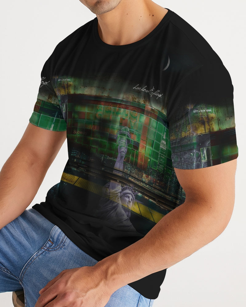 Premium Graphic Printed T Shirt with New York print featuring Statue of Liberty, Radio City, Subway tiles, Vintage New York Map, Empire State and city Skyline.