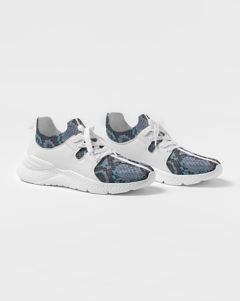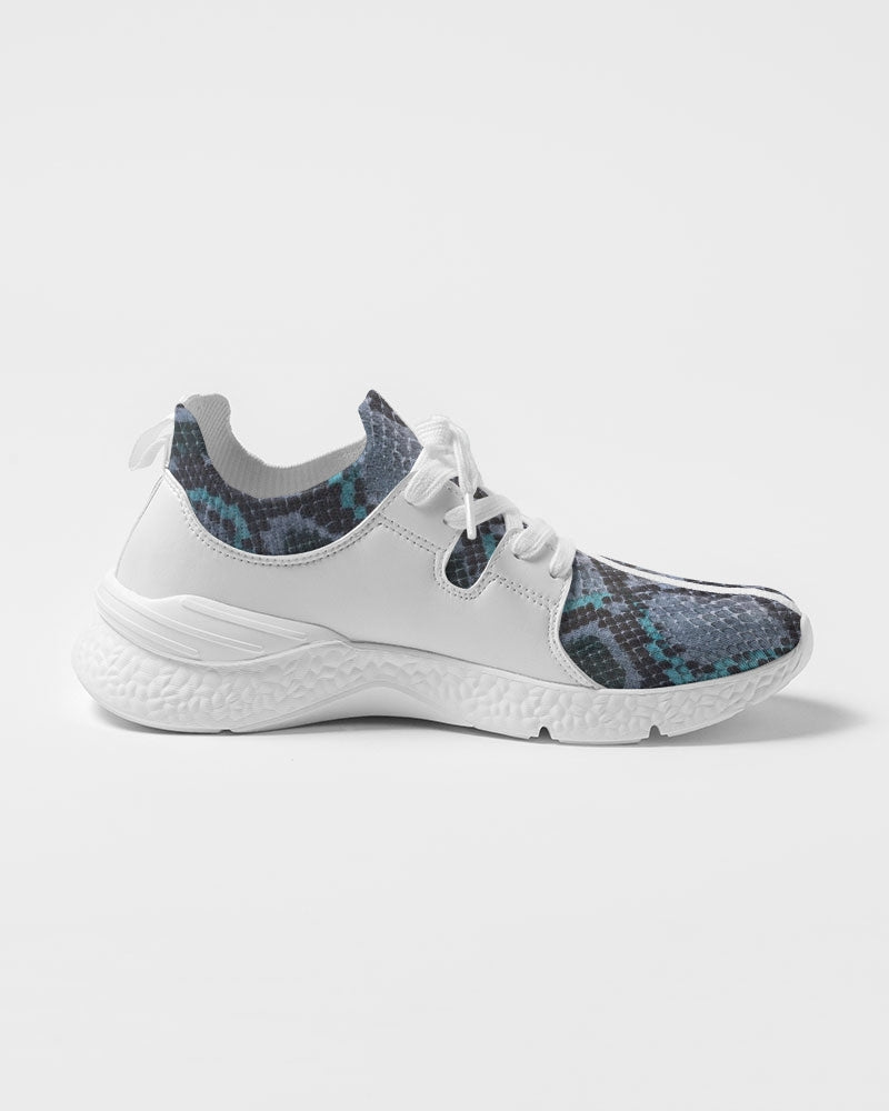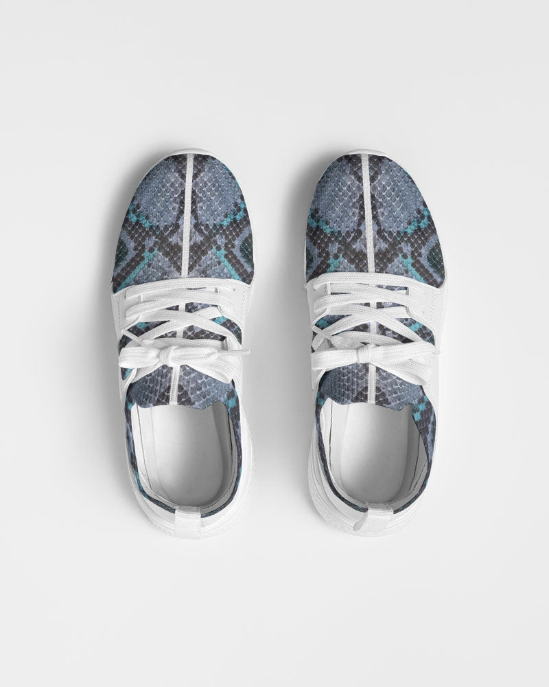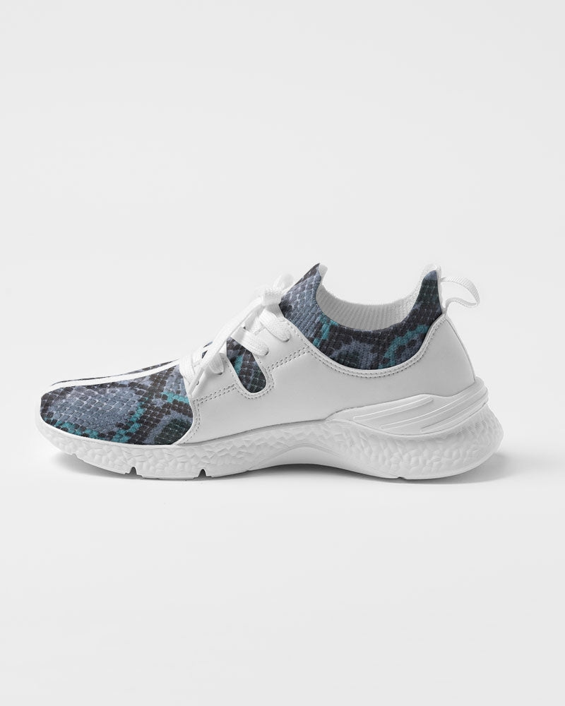 Men's Fly-knit Sneakers in Blue Venom Python Print with white detailing. Athletic style silhouette for casual, everyday, sport / gym / exercise. Exclusive print designed by Harlow & Lloyd.