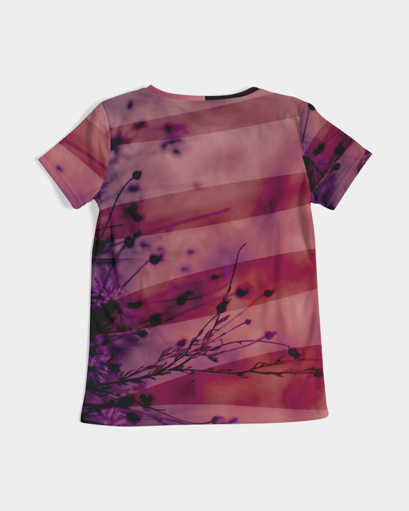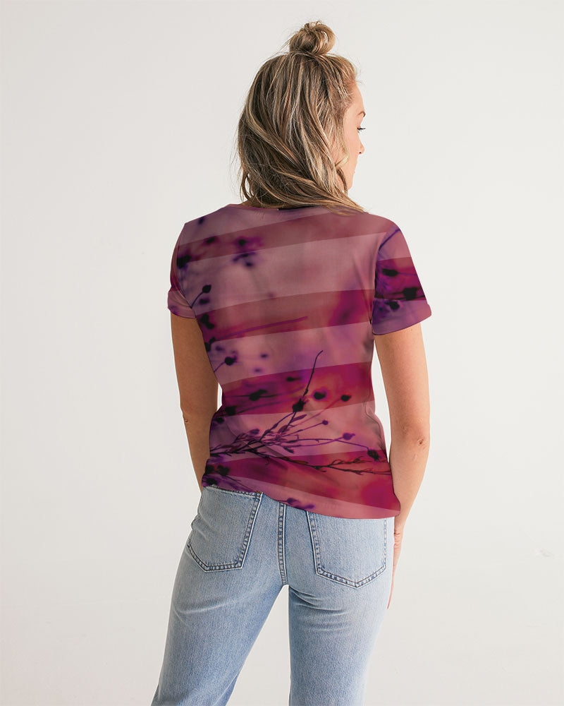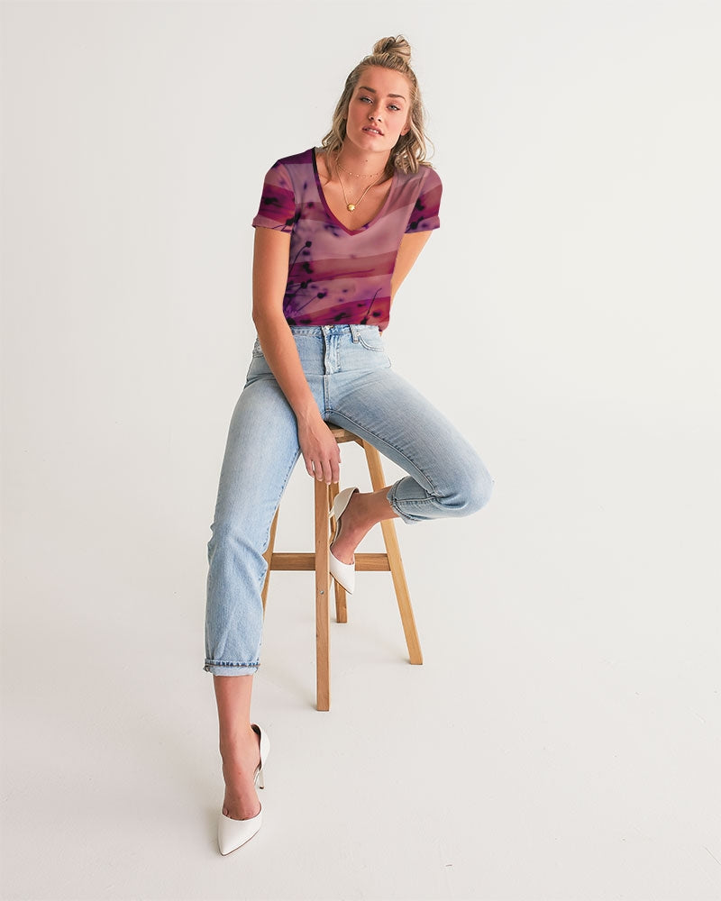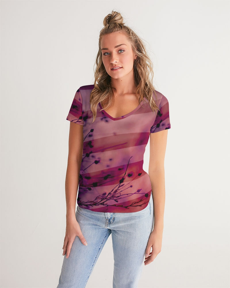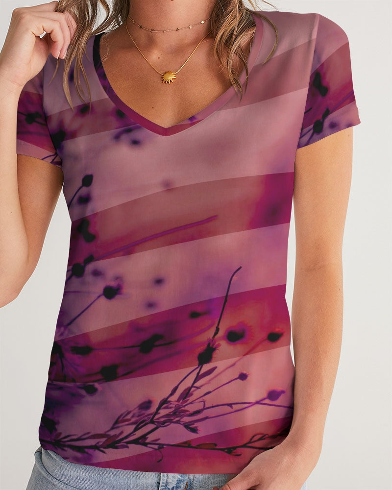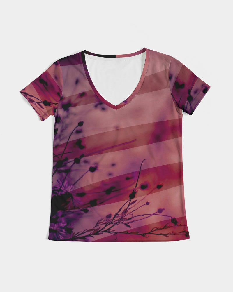 Women's V-Neck Printed T Shirt in Magenta red featuring an abstract blurred nature print of flowers in a field overlayed with stripes.