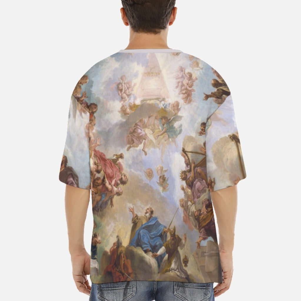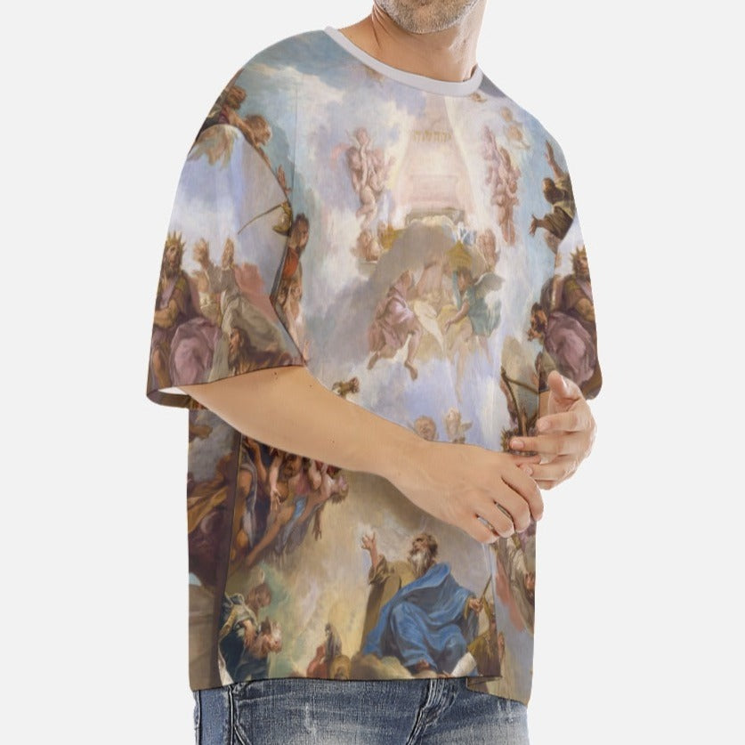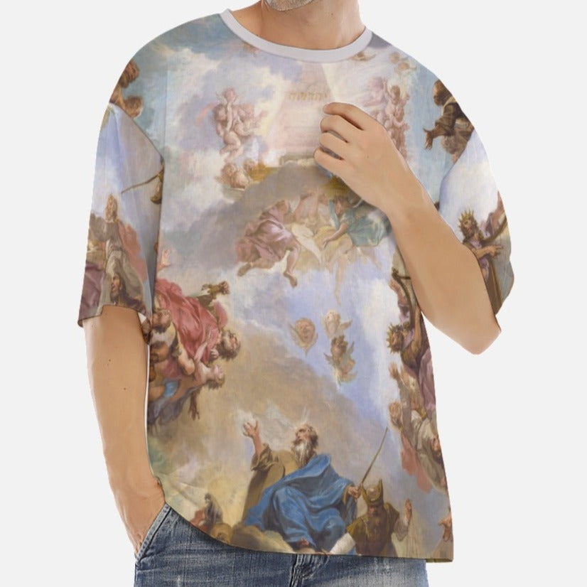 Our Adoration Biblical Print Men's Drop Shoulder T Shirt features an all over religious style painting from the 18th century. This oversized style shirt is manufactured in mens sizing but can be worn by any gender. The loose jersey style fabric is breathable and comfortable. This is a drop shoulder design, which you can size up or down, depending on your desired look from small through to 2XL. Please refer to the size chart for measurements before ordering.