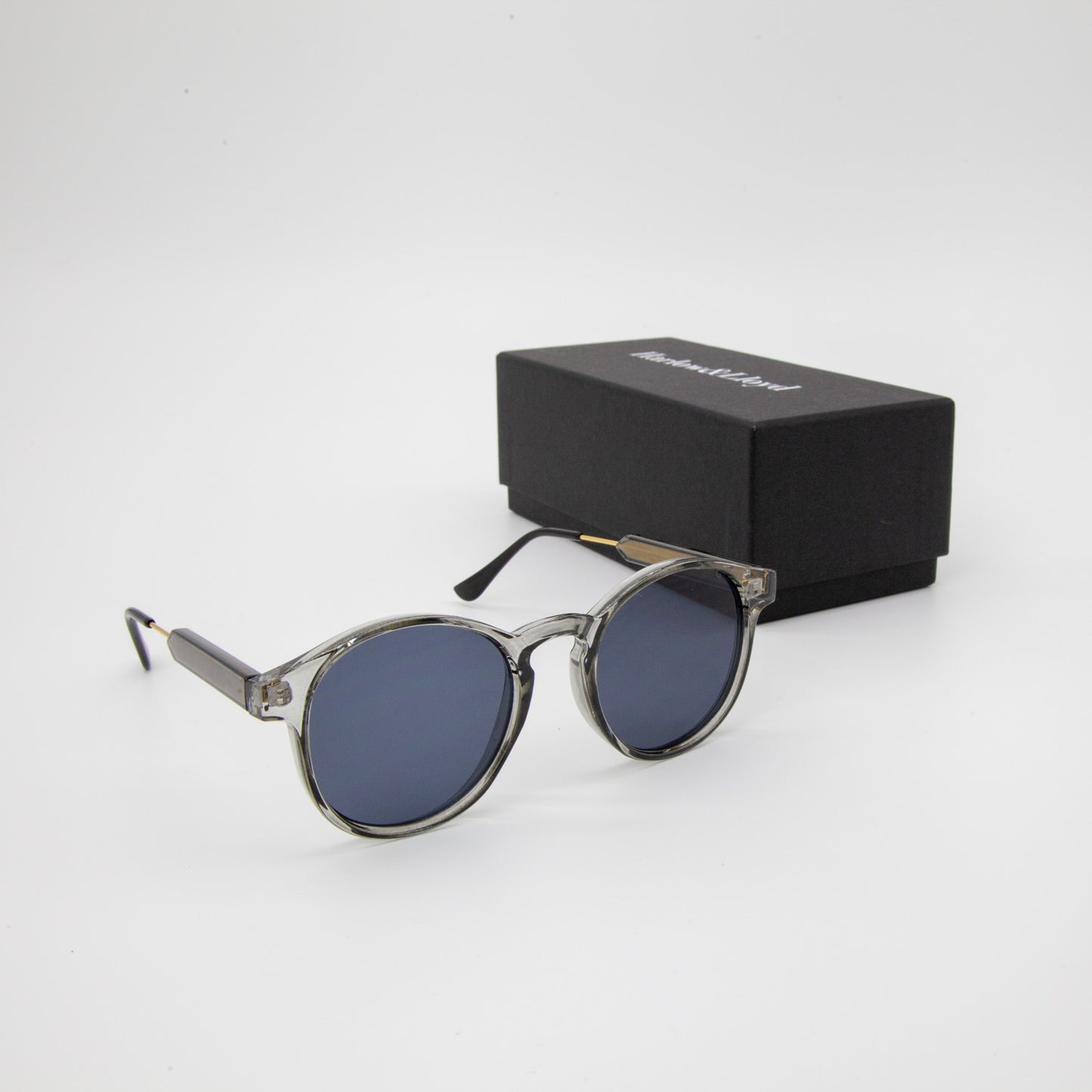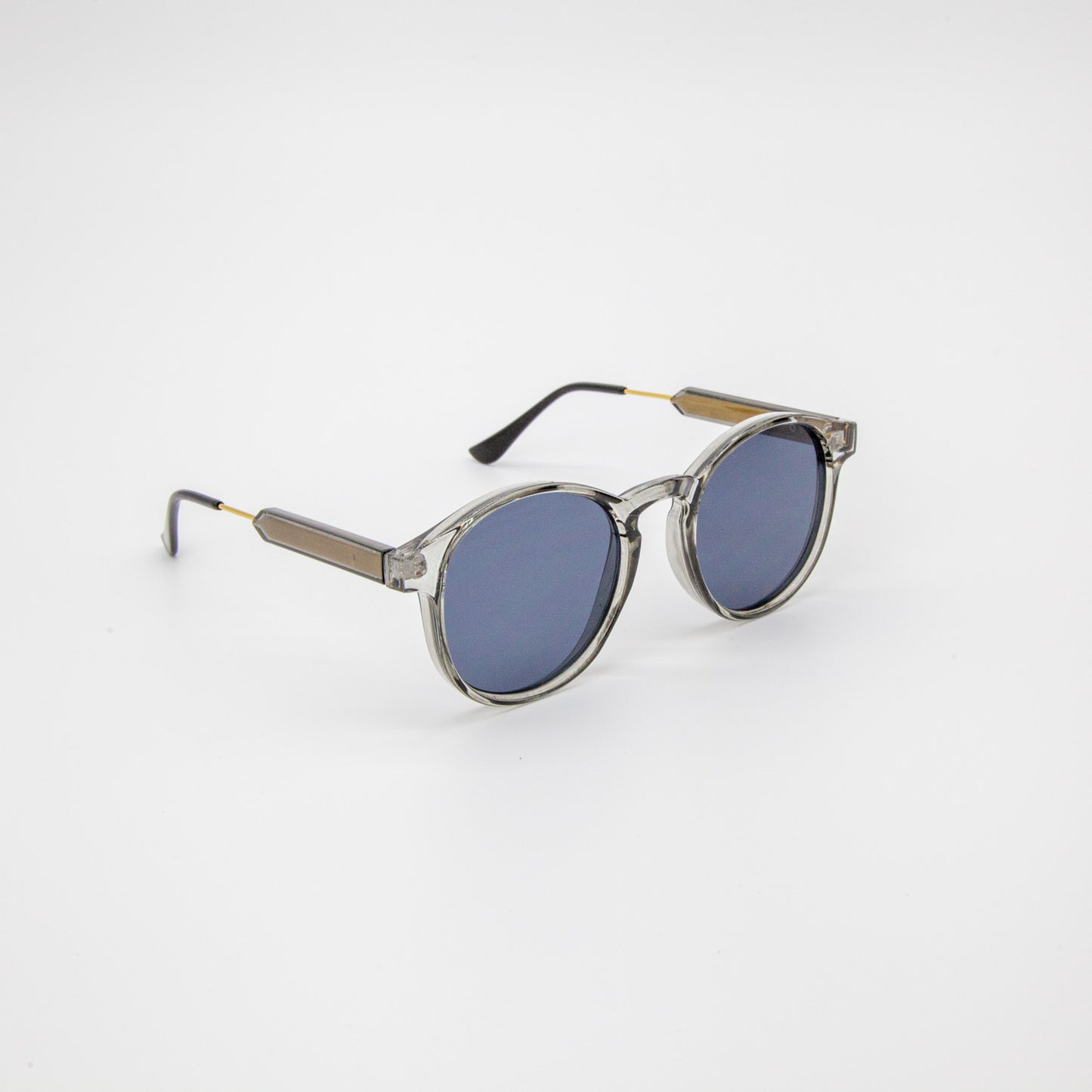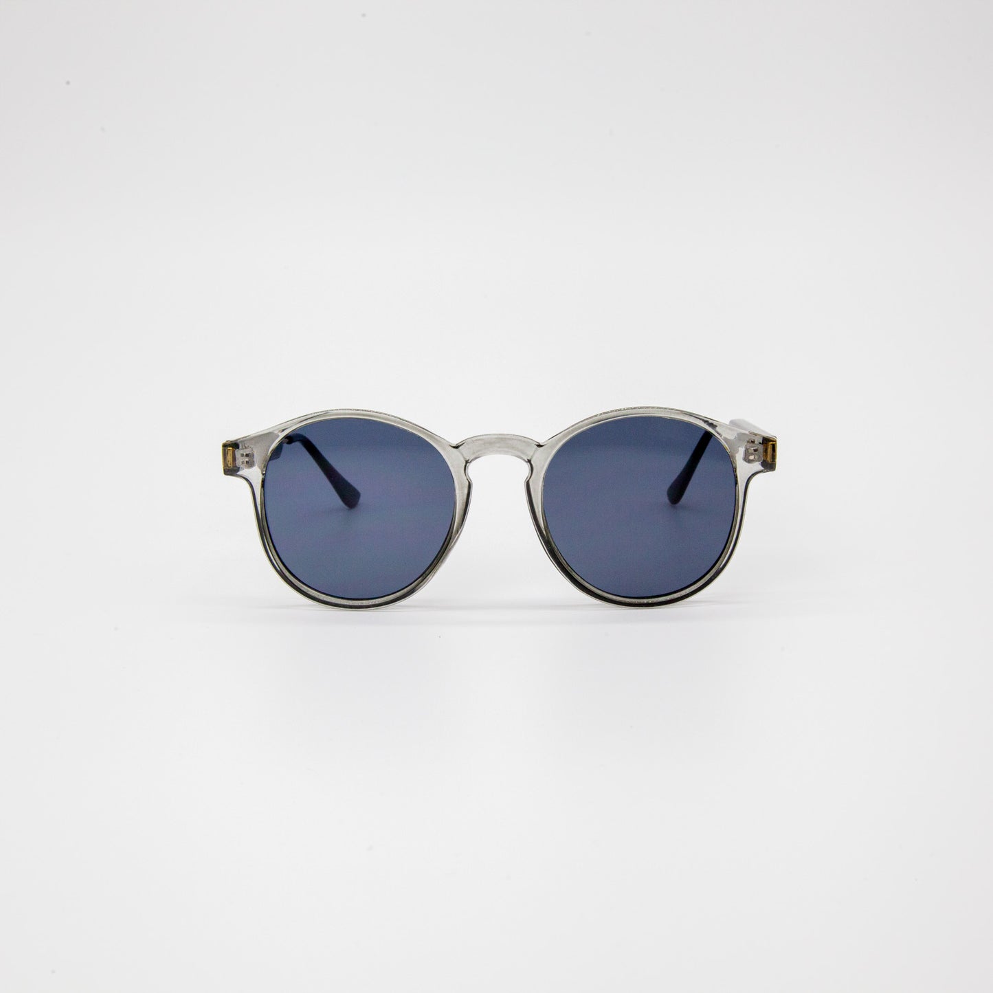 Our Noah Round Frame Sunglasses feature a classic rounded shape with timeless sophistication. The transparent grey lens, and gold arm with detailing plays well together for a vintage look.