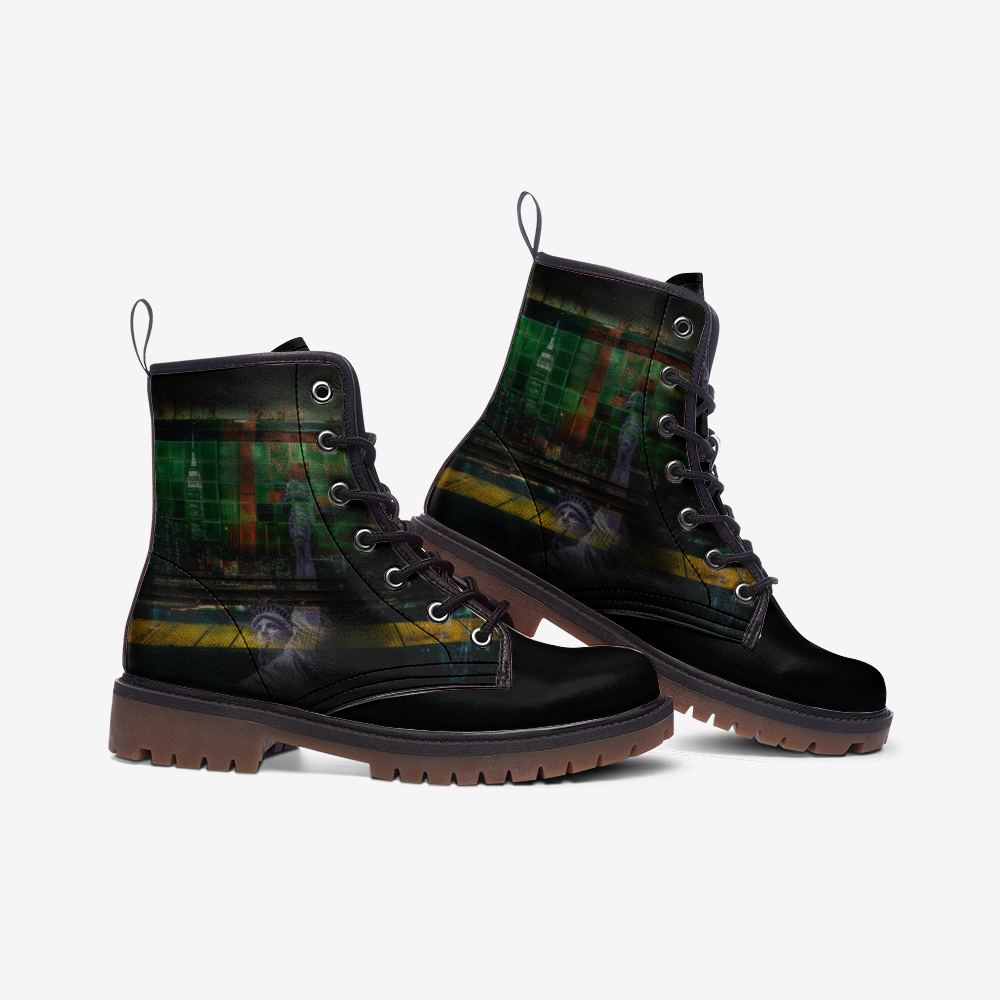 Sleek Graphic Combat Boots with New York print featuring Statue of Liberty, Radio City, Subway tiles, Vintage New York Map, Empire State and city Skyline.