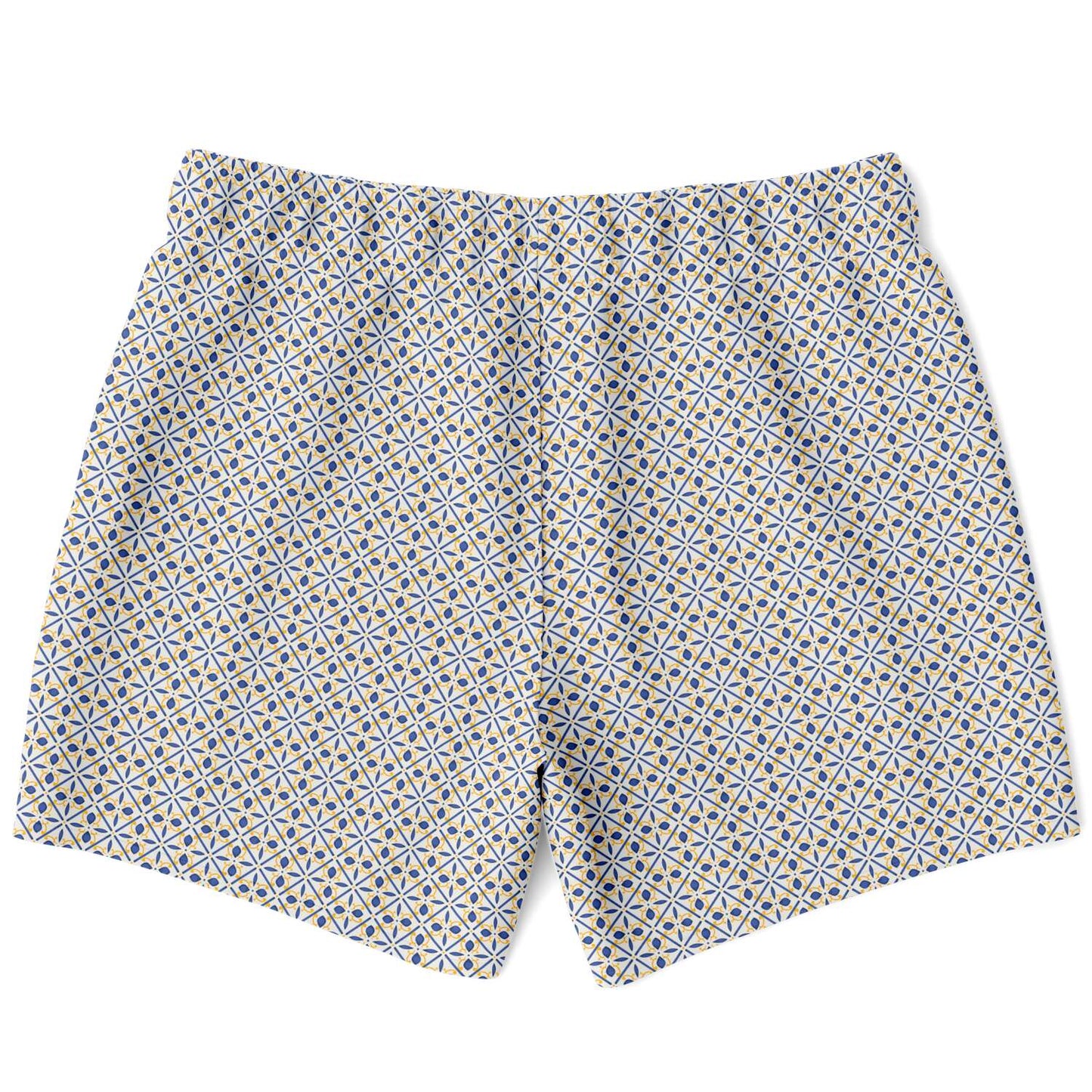 Our Porto Swim Shorts are inspired by Portuguese tile patterns of Europe. They feature a mosaic pattern in blue and yellow, over off white. These short length swim trunks hit above the knee so you can show a bit of leg. They come in a fast-dry fabric, and feature a drawstring waistband, mesh basket lining and mesh-lined side pocket.