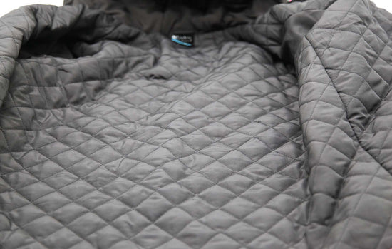 This designer jacket features a cream collar, cuffs and hem. The thick quilted lining in black ensures comfort and warmth.