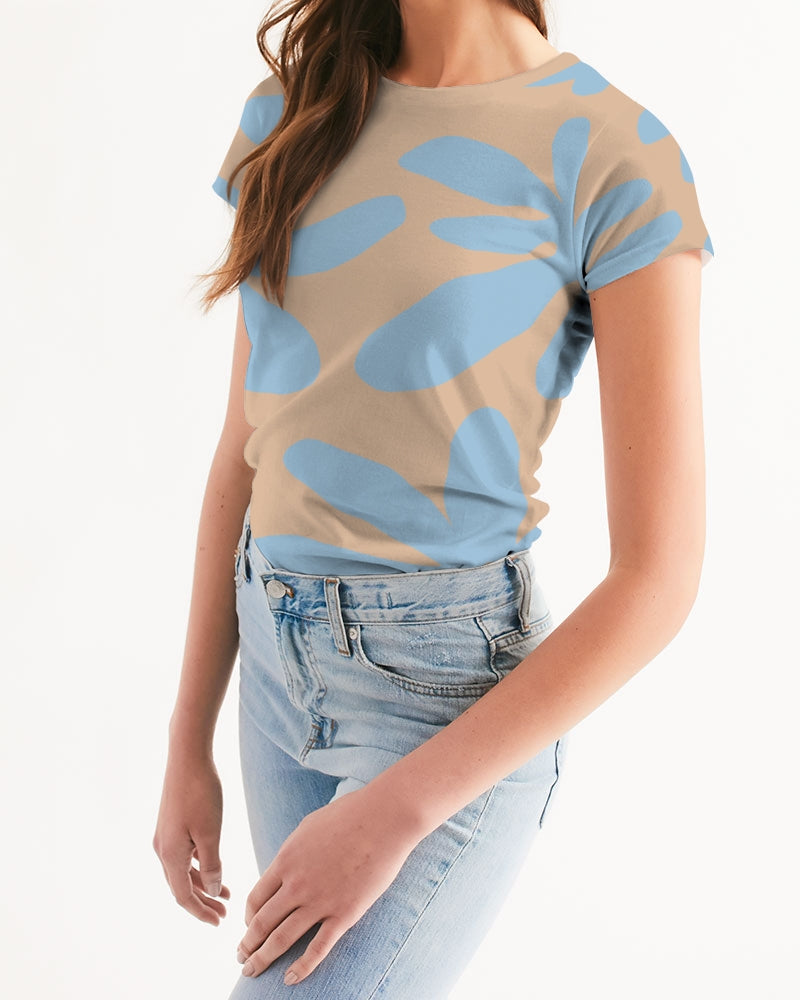 Step out of your comfort zone in our Blue & Brandy Abstract Flowers Women's T Shirt. Featuring bold abstract flowers in soft blue and brandy beige tone, it's a contemporary look. Pairs perfectly with jeans and shorts. Take a risk and make a bold statement with this one-of-a-kind look!