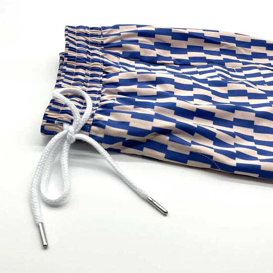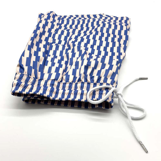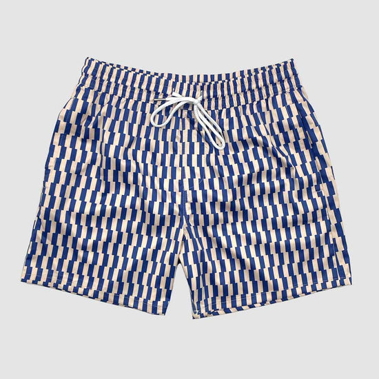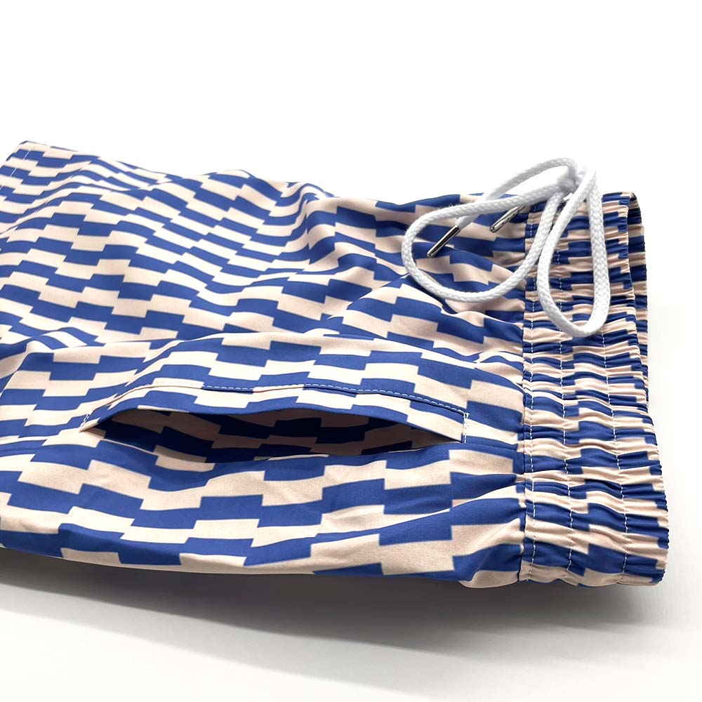 Our Blue Vanilla Harmony Swim Shorts are awesome. The blue stripe check pattern on a vanilla cream tone is on-trend and contemporary. They feature two side pockets, white interior mesh lining, and adjustable waistband with fabric drawcord. Manufactured from superior quality material with fine stitching.