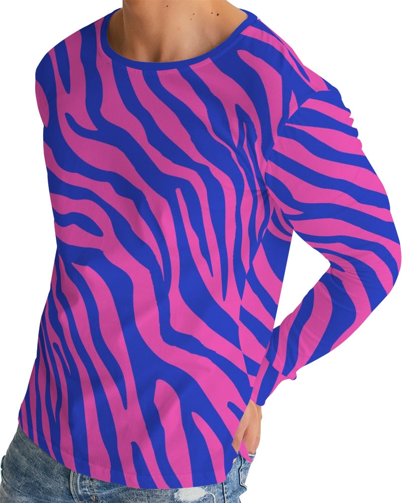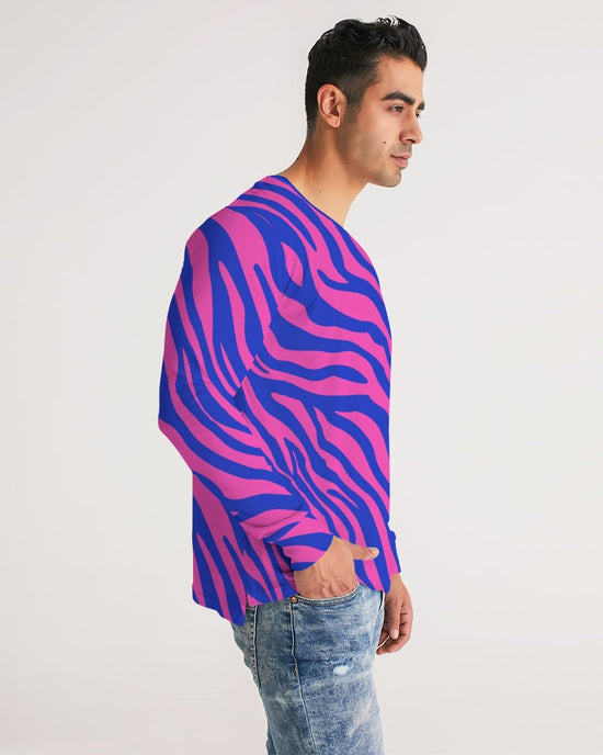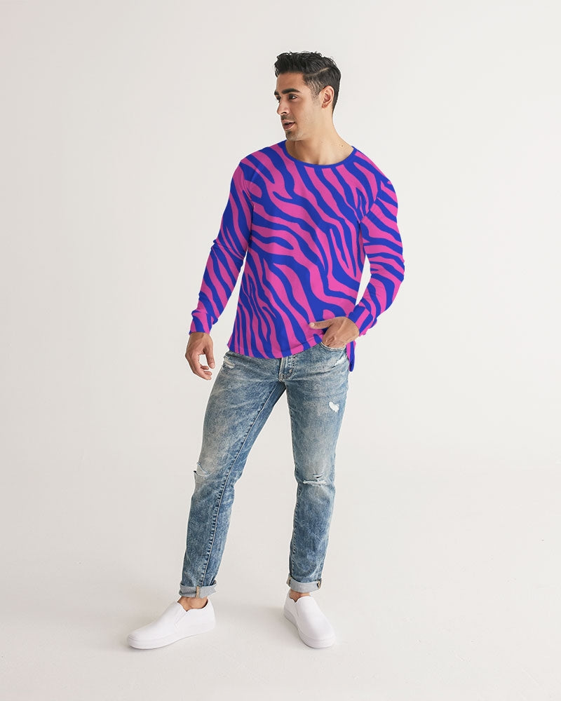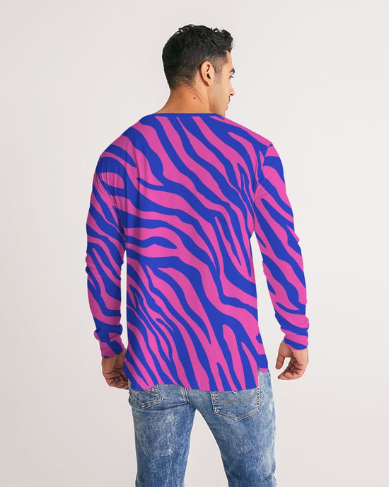 Our Electric Zebra Men's Long Sleeve T Shirt is made of soft, breathable fabric for all over comfort. Its slim fit, straight hem and classic crew neck offer a seamless look. Not for introverts, this bold zebra print in deep rose and blue will have you making a statement at the bar or out for dinner. A designer tee to add to your collection.