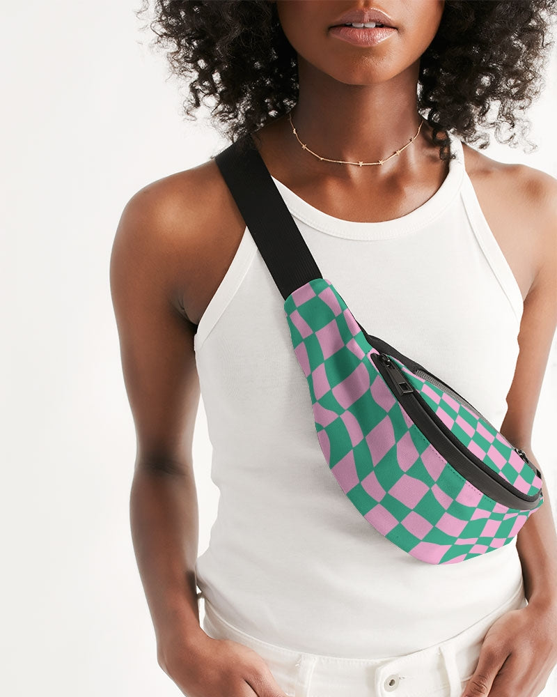 Our Bubblegum & Green Checkerboard Crossbody Sling Bag is the perfect accessory for on the go. Wear it over the shoulder, or around the waist for easy access to your things. This checkerboard crossbody bag has two zip compartments, an adjustable belt and a buckle closure. This contemporary all over pink and green checkerboard pattern is a fashionable choice.