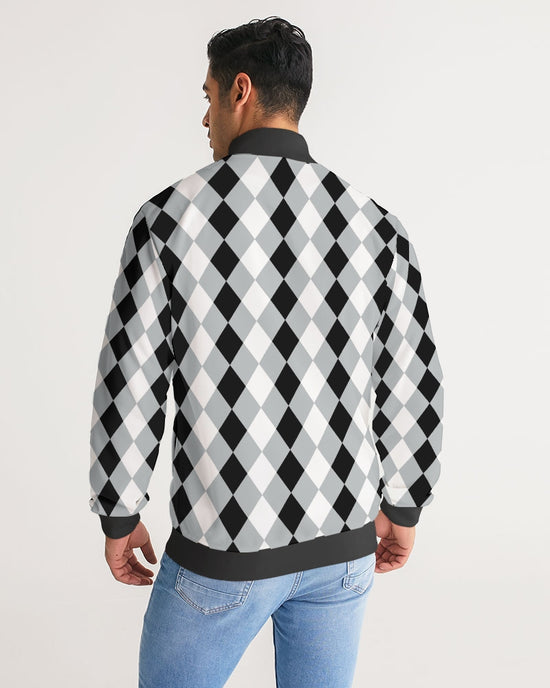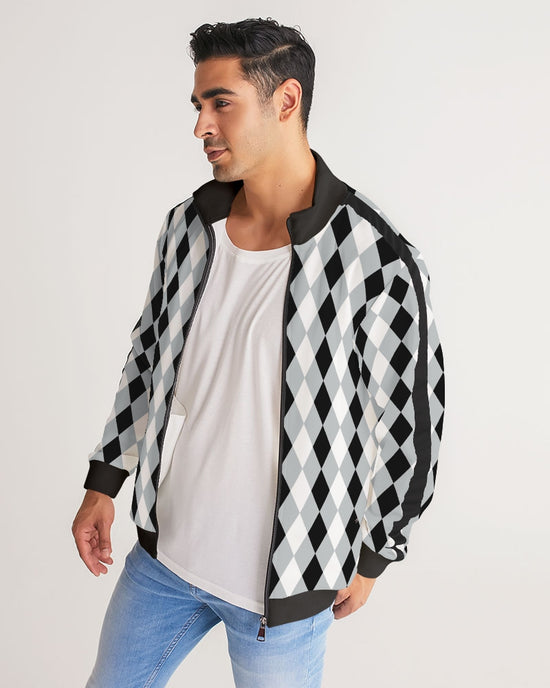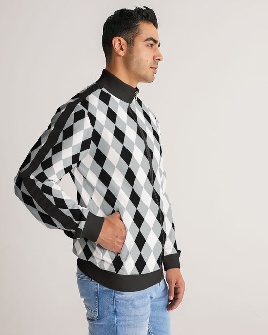 Our Harlequin check Track Jacket in classic Black, White & Concrete will be your daily go-to. The all over check pattern, high neck zip up ribbed collar, and striped sleeve has a contemporary feel. Perfect jacket for college, a cafe meet up, or paired with joggers on your way to the gym. A unique gray, black and white check track jacket to add to your wardrobe.