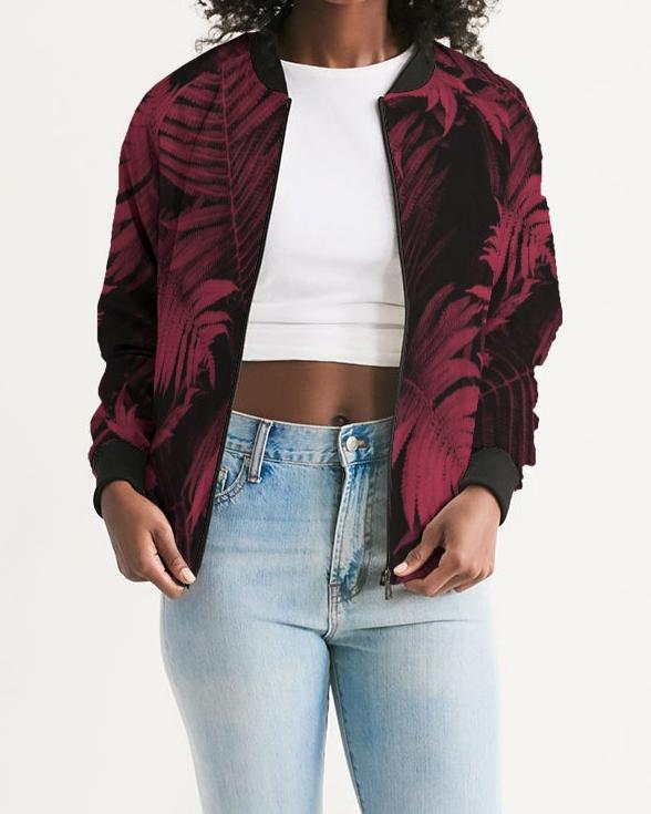 Stay on trend in our Red Ferns Women's Bomber Jacket. Featuring a bold tropical fern print in vibrant red and black, this jacket is sure to make a statement. Perfect for adding a touch of freshness and individuality to any outfit. Elevate your wardrobe with this unique piece. Designed by Harlow & LLoyd.