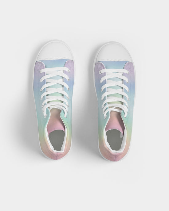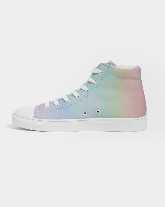 Our Soft Rainbow Hightop Canvas shoes feature an all over subtle rainbow. Pair with jeans, shorts or pants for any occasion. Our canvas high tops feature a soft insole for all day comfort, and an environmentally friendly vegan leather toe cap. Bound to be your daily go-to.