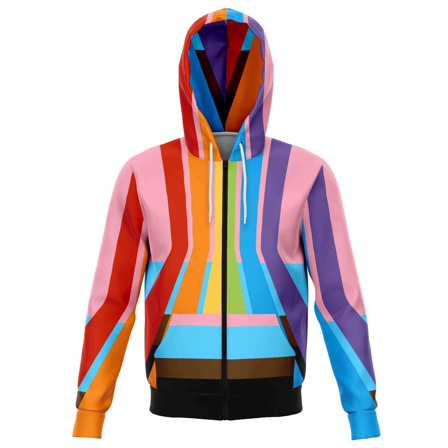 Vertical rainbow stripes adorn the hoodie over horizontal pink, blue brown and black stripes. This hoodie represents a united community of individuals regardless of who you're attracted to, your gender, or your color. A beautiful design that can be worn by anyone.